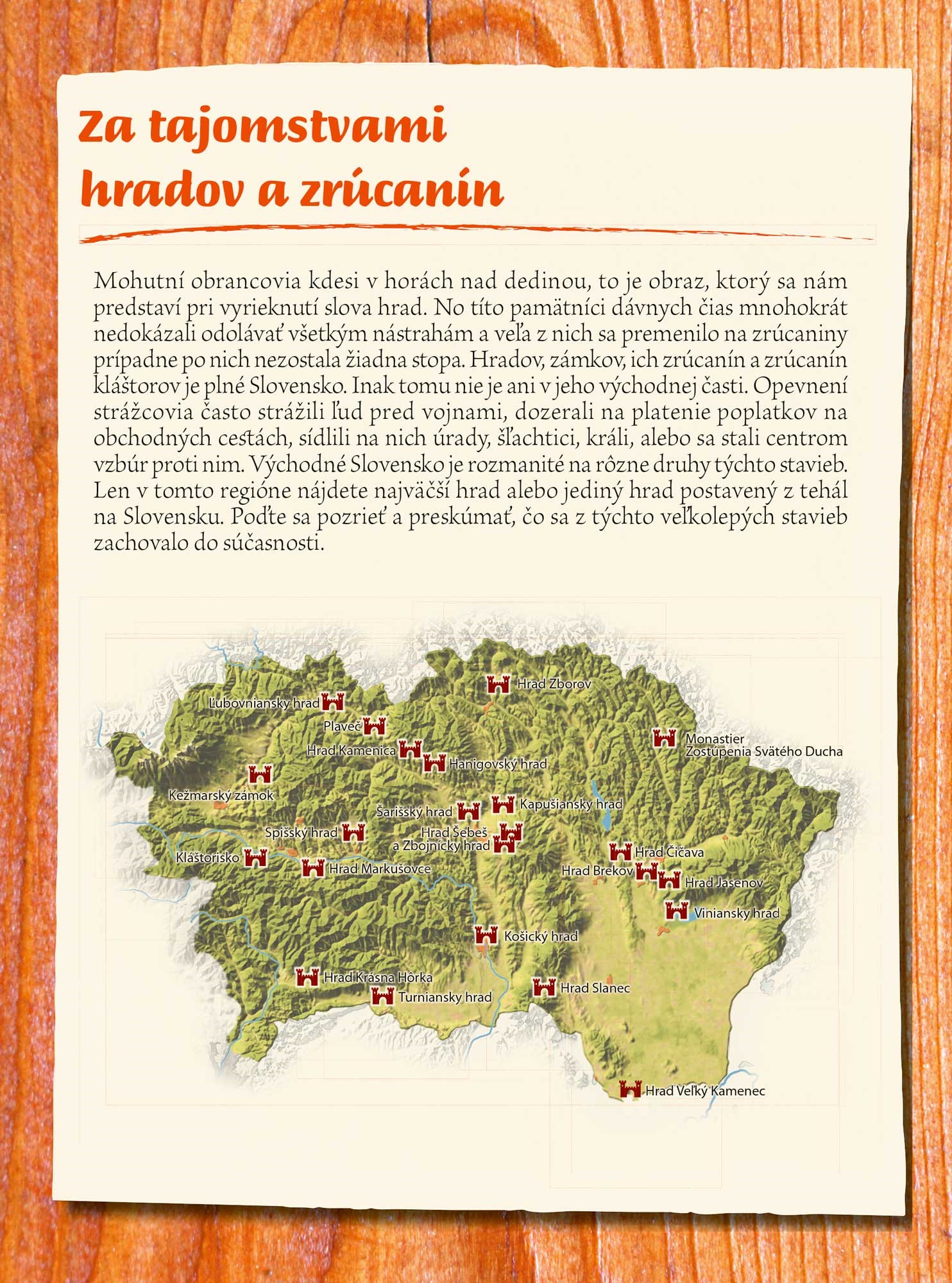 V tejto knihe vám prinášame výber toho najlepšieho, čo východné Slovensko ponúka. Vyše 110 prehľadne usporiadaných výletov, ktoré vás zavedú do rozmanitej prírody, pomôžu vám odhaliť tajomstvá historických pamiatok alebo vám predstavia spoločenské podujatia s najrôznejšími atrakciami. Vďaka praktickému zatriedeniu, dôležitým upozorneniam aj informáciám o cenách a otváracích hodinách vám ponúkame možnosť čo najlepšej predstavy o konkrétnych miestach. Nechýbajú ani rady o ideálnom dopravnom spojení a prístupe. Rodiny s deťmi využijú informácie o stupni náročnosti a dĺžke vytipovaných trás alebo nevyhnutných peších presunov. Prajeme vám šťastnú cestu a veľa krásnych cestovateľských zážitkov!
