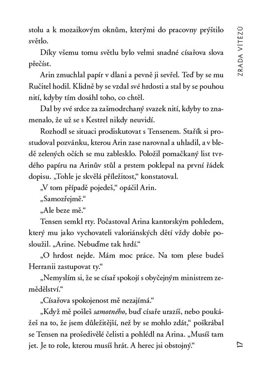 Kestrel svolila ke sňatku s korunním princem, a zajistila tak herranskému lidu svobodu a územní autonomii. Sama se však ocitla ve zlaté kleci císařského paláce. Svoje nové postavení ovšem hodlá maximálně využít. Chce změnit kruté válečné taktiky svého národa, a tak se bez Arinova vědomí stává tajnou informátorkou herranského ministra špionáže. Pouští se do nebezpečné hry, za kterou hrozí trest nejvyšší – smrt.