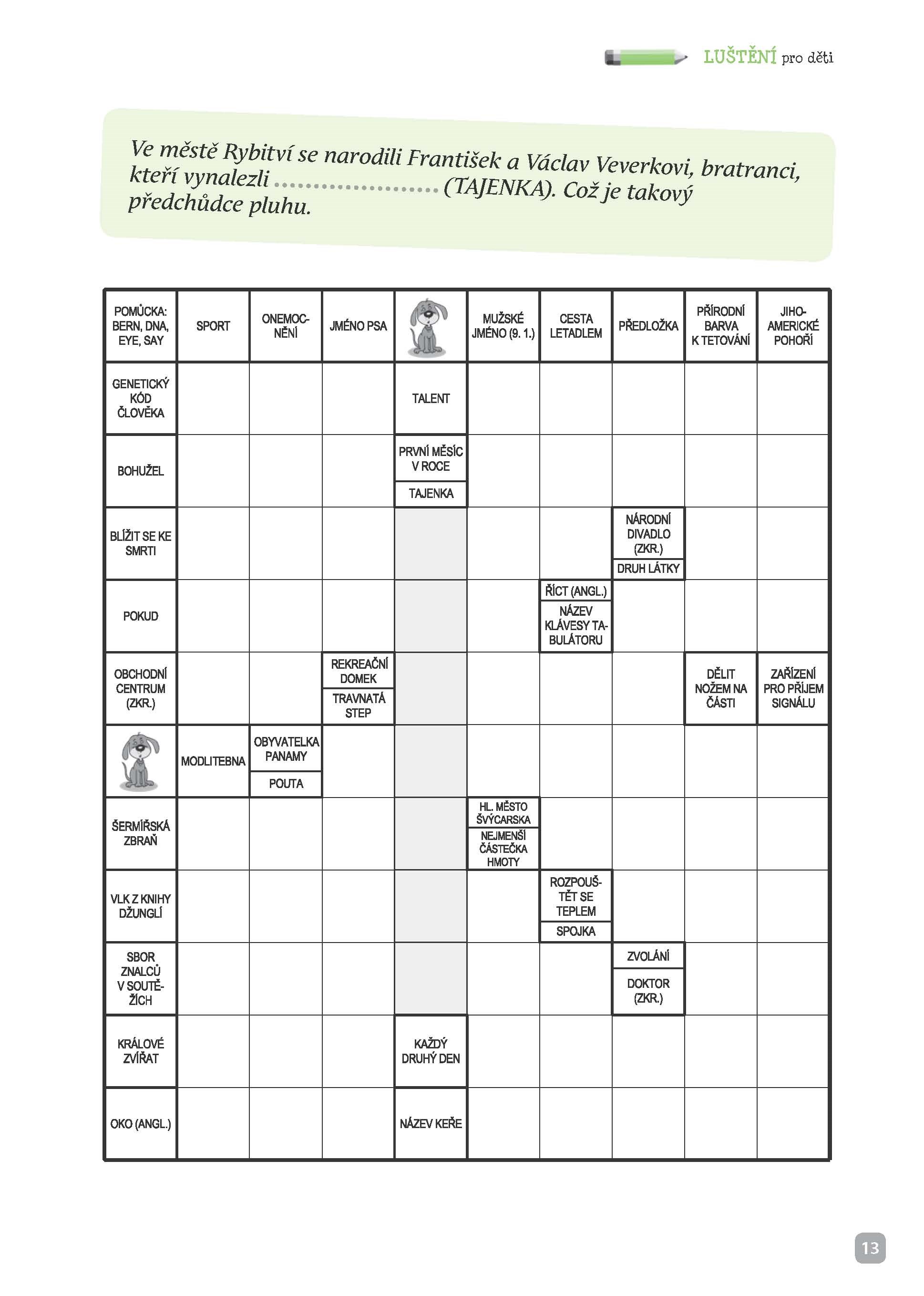 Křížovky, osmisměrky, sudoku či spojovačky a k tomu navíc spousta zajímavostí o České republice. Víš, na kterém místě nejvíc fouká a který hrad postavili templářští rytíři? Tušíš, kdo vynalezl kontaktní čočky a ve které jeskyni našli pozůstatky neandertálců? Pokud ne, je čas se to dozvědět. Roztoč mozkové závity a pusť se do toho!