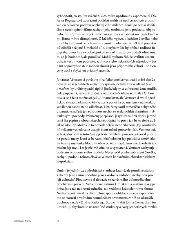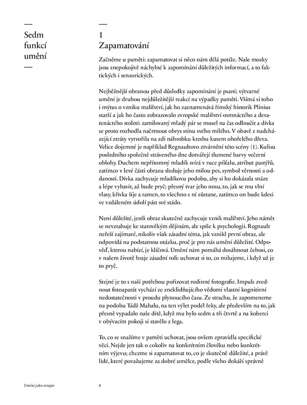 Často slýcháme, že umění je velmi důležité. Jen zřídka se ale dozvíme, proč vlastně. Alain de Botton a John Armstrong jsou přesvědčeni, že umění nám může pomoci řešit ta nejniternější a zároveň nejobyčejnější dilemata: Proč mě nebaví moje práce? Proč mi připadá, že všichni ostatní mají zajímavější život než já? Co mám dělat, aby můj vztah fungoval lépe? Proč musí být politika tak deprimující? Jejich kniha představuje nový způsob interpretace umění: vnímá ho jako terapii, která nám účinně pomáhá vypořádat se s každodenními problémy.
