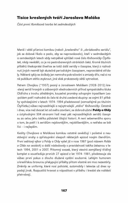 Jaroslav Malák patří k nejzajímavějším českým ilustrátorům dětské knihy. Jeho svérázný rukopis je stejně nezaměnitelný jako rukopis Adolfa Borna či Věry Faltové. Všechny tři tvůrce spojuje též tvorba komiksových seriálů pro slavný časopis Čtyřlístek. Jaroslav Malák pro něj spolu s Petrem Chvojkou a později též se Stanislavem Havelkou vytvořili seriál Polda a Olda o přátelství obyčejného kluka s neobyčejným skřítkem, který se dokáže proměňovat. Jejich veselé příhody patřily ve Čtyřlístku k nejoblíbenějším. Teď vycházejí knižně v trojsvazkovém souborném vydání. První svazek zahrnuje 27 příběhů, tak jak za sebou vycházely chronologicky ve Čtyřlístku, a je doplněn doslovem Pavla Kořínka, který se věnuje počátkům tvorby veskrze originálního ilustrátora a kreslíře Jaroslava Maláka.