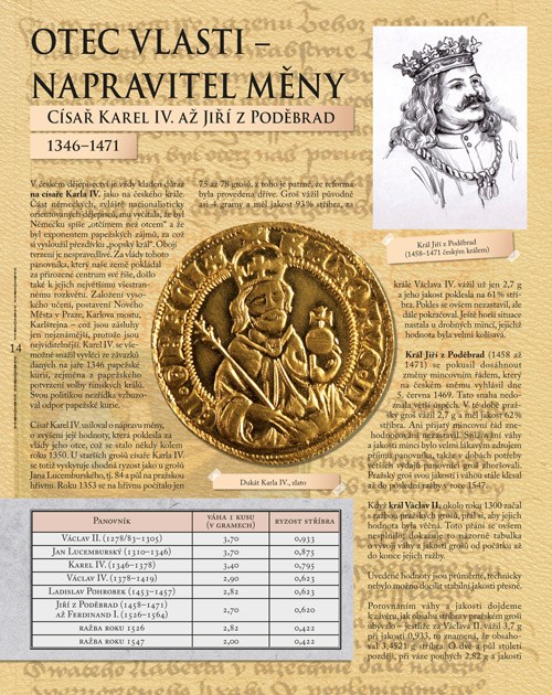 Vstupte do dějin naší země a podívejte se, ve které době se užívaly jaké peníze. Naše publikace vás povede chronologicky od počátku, kdy ještě fungoval směnný obchod, všimne si mincí keltských denárů zavedených Přemyslovci a dále po sobě nastupujících brakteátů a grošů. Zjistíte, kterými dukáty se platilo v době vlády Habsburků, kdy nastoupily tolary a kdy je nahradily zlatky a ty zase koruny.