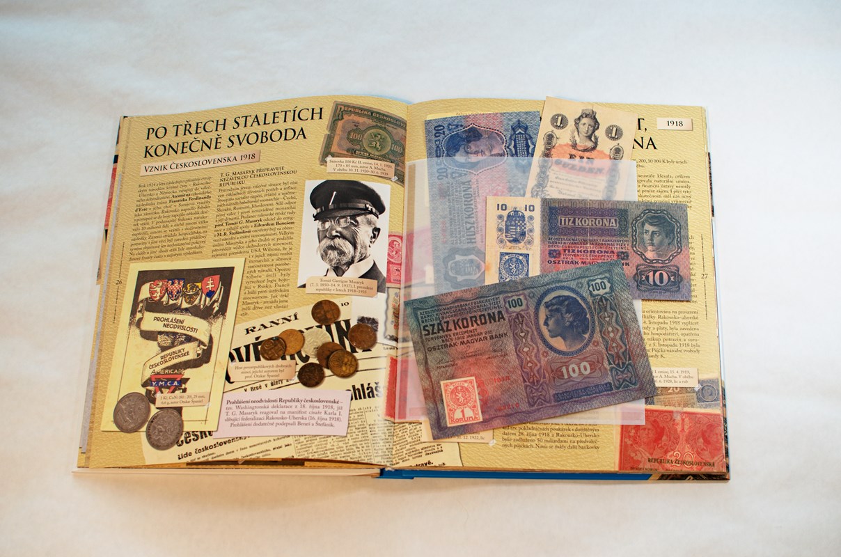 „Muzeum“ v knize obsahuje desítky dobových fotografií, obrazů a kreseb. V kapsách navíc najdete repliky středověkých mincí a kopie nejpozoruhodnějších bankovek a státovek.