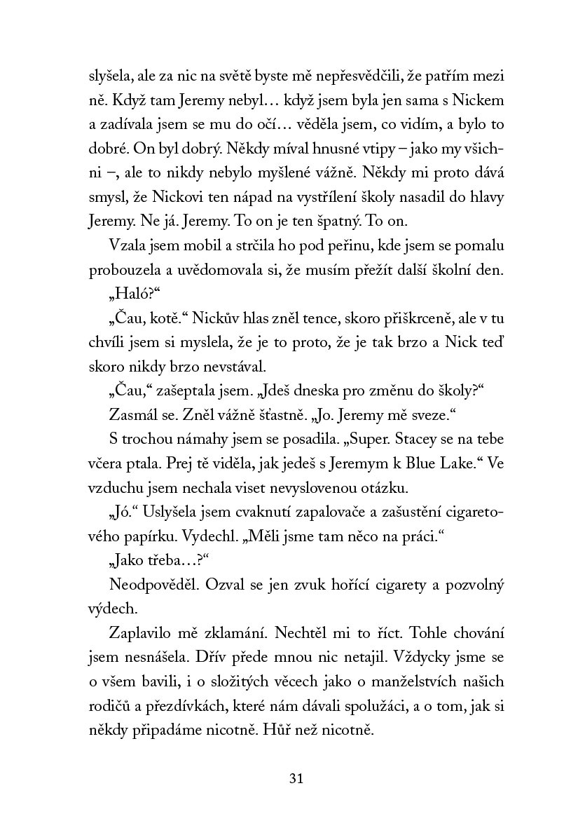 Po létě stráveném v ústraní se teď Val vrací do školy. Pohledy spolužáků i vlastní rodina jí neustále připomínají, čeho byla součástí. Musí se vypořádat nejen s Nickovou smrtí, ale především s důsledky toho, co udělal. Vina padá i na ni, ale jakou roli vlastně při tragédii sehrála? Dokáže odčinit to, co pomohla stvořit, ale nikdy nechtěla přivést k životu?