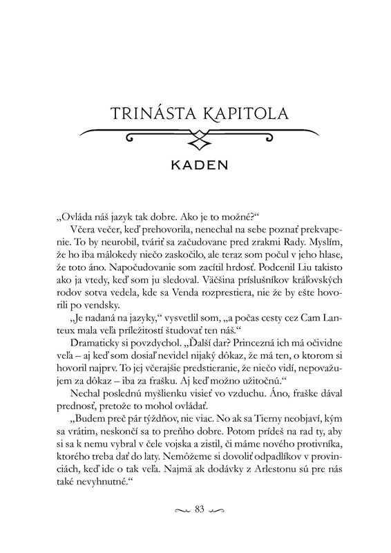 Kaden, zabijak, člen rahtanu, si ma niečím získal už v prvej knihe. V tejto máme možnosť vidieť jeho rozpoltenosť medzi láskou a povinnosťou, sledujeme, ako sa vyvíja. Každý pohľad do jeho hlavy som si užila, pretože jeho nerozhodnosť len pridávala na komplexnosti. Už teraz som zvedavá na veľké finále, pretože sama neviem určiť, na ktorú stranu sa táto postava postaví.
