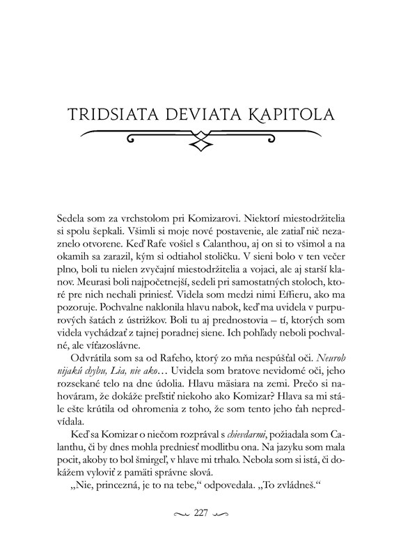 Lia, prvá princezná Morighanu, sa v tejto časti vyvinula, jej postava prehĺbila a stala sa z nej jedna z mojich obľúbených hrdiniek, pretože aj keď mala strach a mala čo stratiť, hrala nebezpečnú hru s nebezpečnými ľuďmi. Snažila sa pochopiť nepriateľa, hľadala medzierky v ich obrane a uvažovala, čo urobiť pre prežitie a záchranu milovaných.