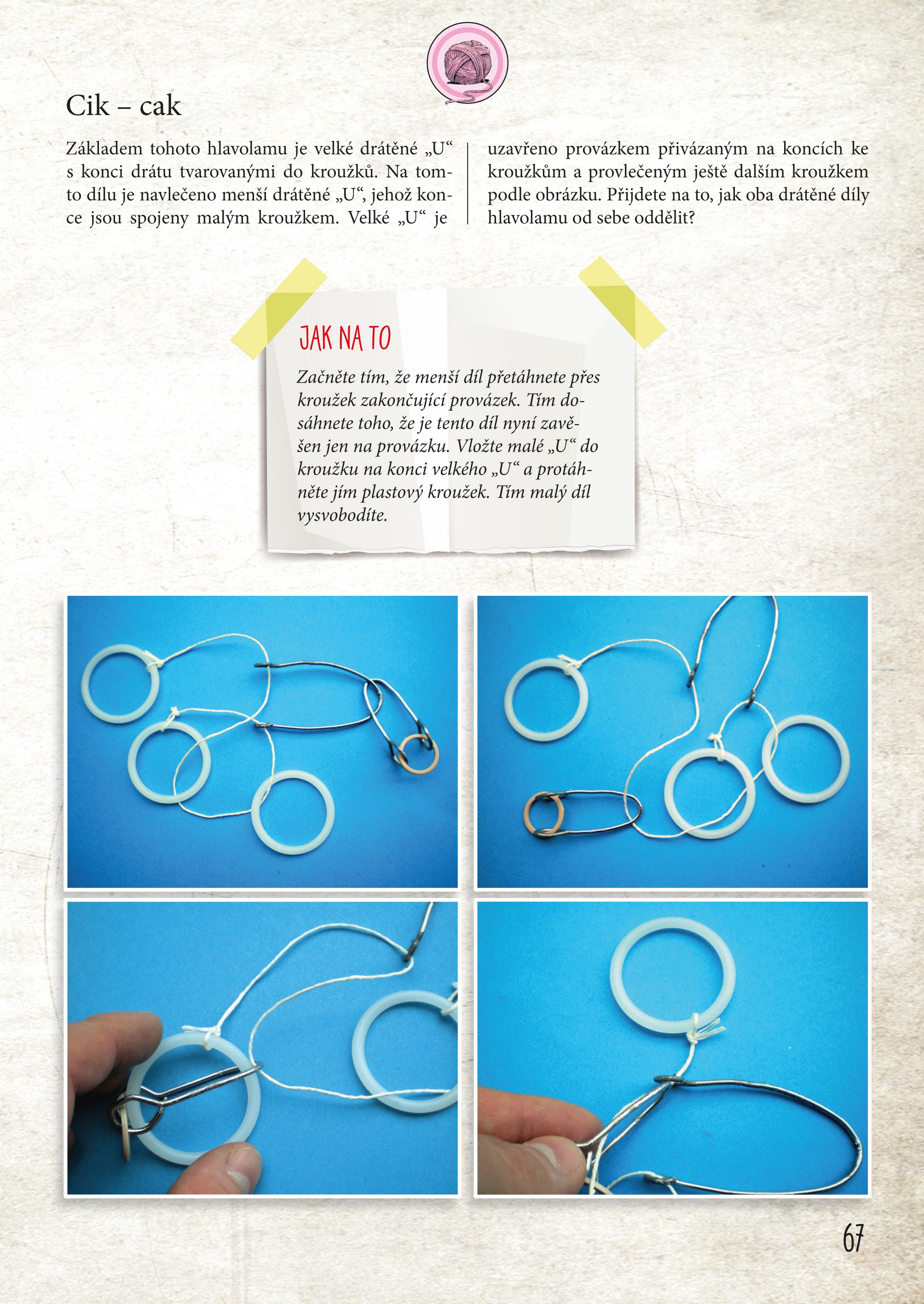 V druhé části knihy vás autor Radek Chajda povede k tvorbě hlavolamů – začnete známými drátěnými srdci a pouty, budete překvapeni, jaká kouzla umí chytře provléknuté provázky, a můžete si sestavit hlavolam ze dřeva, kuliček nebo obyčejného papíru. Vyzkoušejte své kamarády! Ať si lámou hlavy a luští hříčky, které jim připravíte.