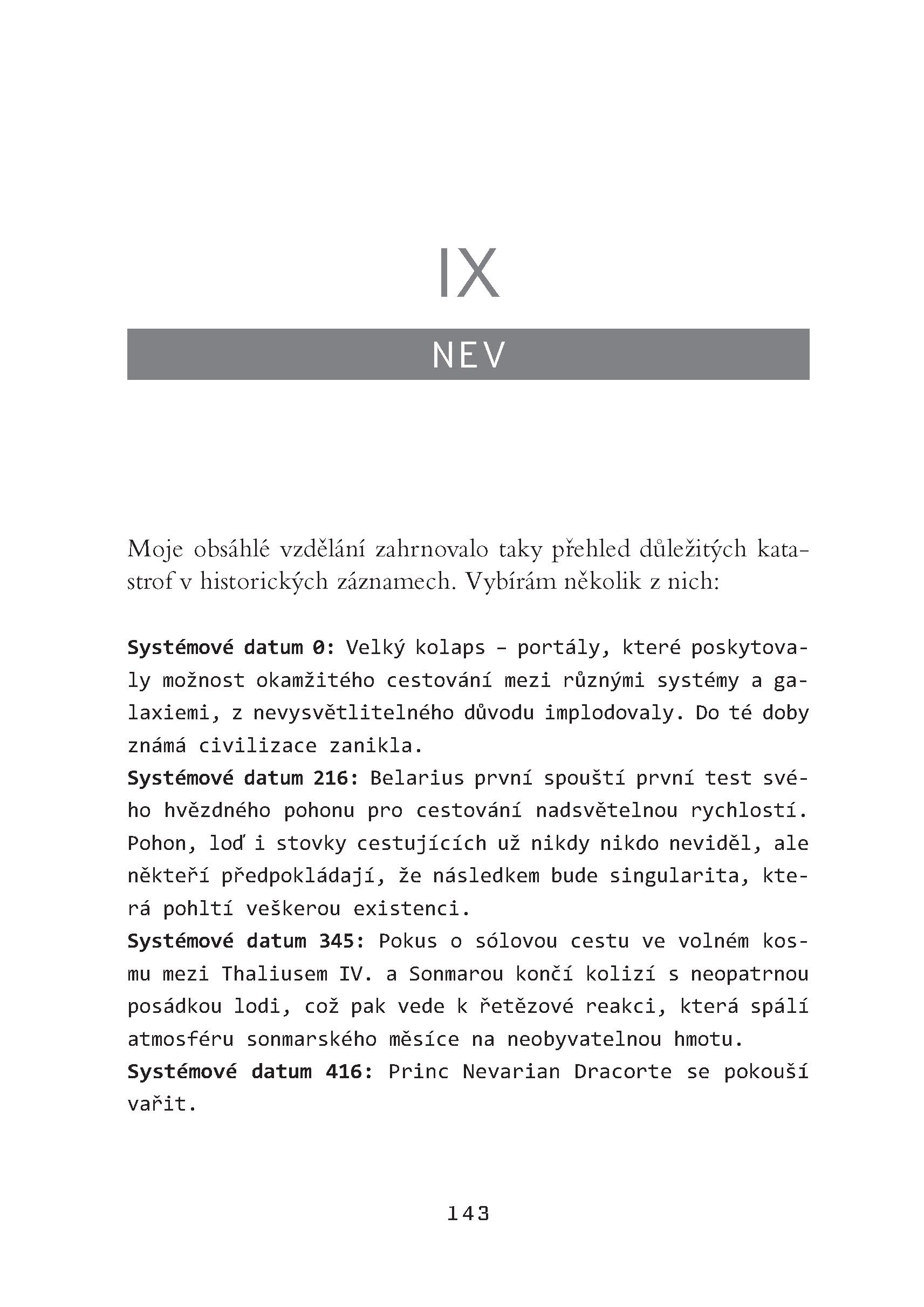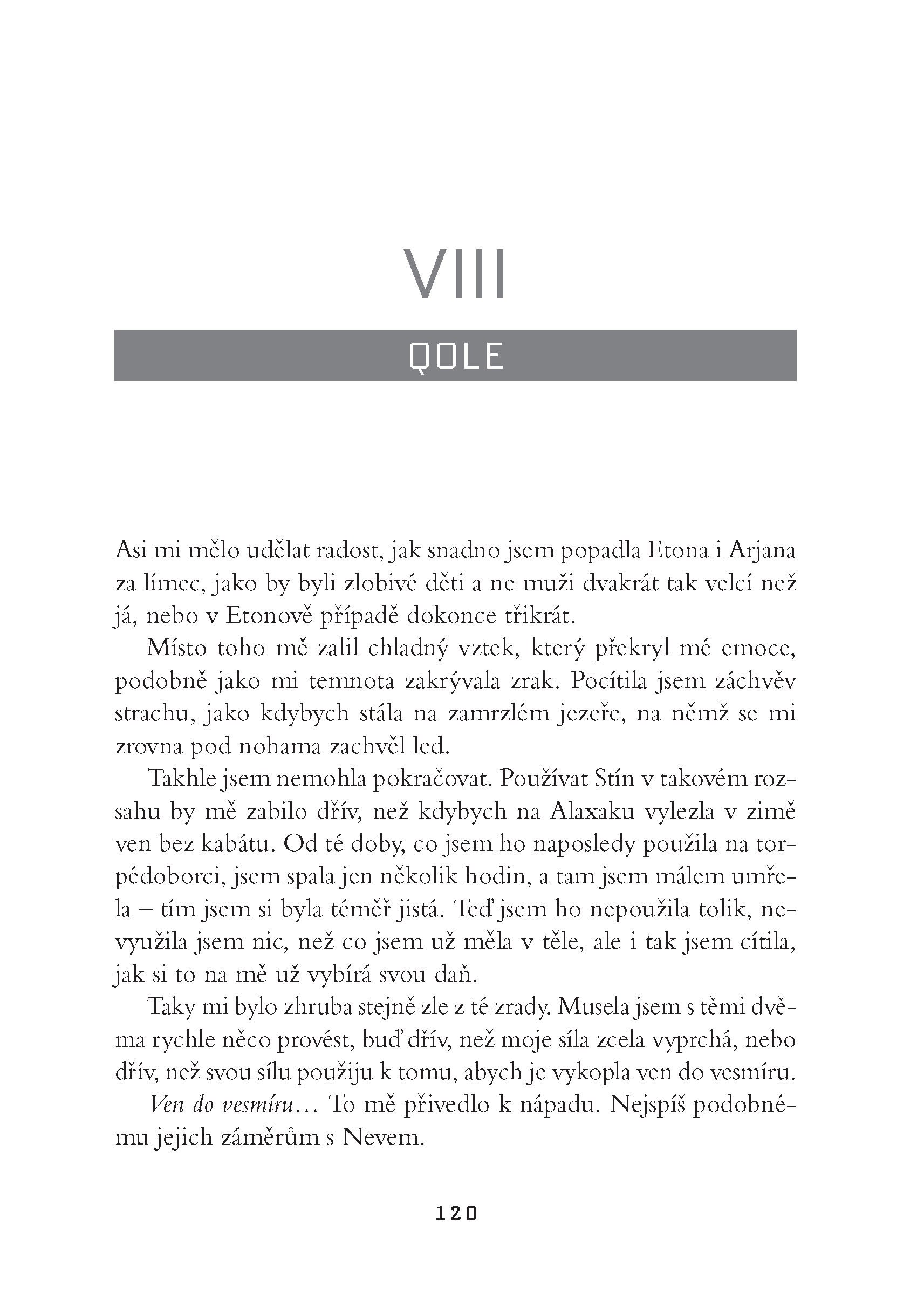 Dej sa odohráva po Veľkom kolapse, ktorý aj keď nebol presne vysvetlený (skoro nikto netuší ako sa to vlastne stalo), zanechal obrovské škody a zmätok v galaxiách. Veľký dopad vidíme na krajine Alaxak, ktorá je doslovne spustošené miesto plné smútku a bolesti. K tomu prispieva aj záhadný stín, ktorý sa používa ako palivo, a je dôležitou surovinou na trhu. Avšak práve vďaka stínu, umiera veľké množstvo ľudí, alebo prinajlepšom "len" zošalie. Lovenie stínu je hlavnou obživou ľudí z tejto planéty, a naša hlavná postava Qole patrí medzi nich. Je kapitánkou vesmírnej lodi, no aby toho nebolo málo, stín ma priamo v sebe, a aj keď vie, že ju a jej blízkych postupne zabíja, nemôže s tým nič robiť (k tomu má 17 rokov). No na začiatku tejto knihy, sa jej svet ktorý pozostáva len z lovenia a cestovania úplné zmení, keď sa do jej posádky dostane cudzinec Nev. Ako sa veľmi rýchlo ukáže, ide o princa z bohatého kráľovstva, človeka z úplne iného sveta, než ona pozná (áno, jedná sa o druhého rozprávača). Avšak okrem chaosu a nebezpečia prinesie ešte jednu vec, to na čo Qole už dlho ani nepomyslela - nádej.