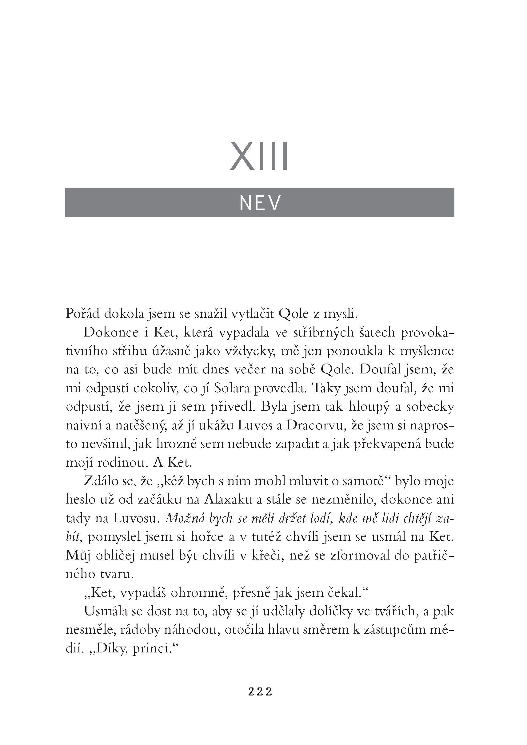 Ak však čakáte, že sa tu jedná o klasický príbeh kde sa to celé bude točiť okolo toho, že sa ľudia z dvoch iných svetov zaľúbia, tak túto knihu veľmi podceňujete. Jemný náznak romantiky tu je, no okrem toho, že na ňu vlastne nikto z nich nemá čas, prvotne musia medzi sebou nájsť nejaké to pochopenie, aby sa vôbec znášali. Zo začiatku som mala pocit, že každý z nich sa pozeral na svet z čisto zo svojej perspektívy, no postupne sme mohli vidieť progres, kde začali chápať, že to v čom vyrastali, neznamená istú pravdu. Neskutočne sa mi tu páčilo, ako sa bral veľký ohľad na rodinné vzťahy a ako nás ovplyvňujú. Kým pre Qole je rodinou jej posádka, kde pokrvný vzťah je vlastne len medzi ňou a jej bratom, pre Neva je to kráľovská rodina, s ktorou ako viete, hlbšie vzťahy môžu byť naozaj komplikované. A tak uvidíme oboch hlavných hrdinov v dvoch neznámych prostrediach, ktoré sú prirodzené pre toho druhého. Ale je to naozaj tak?
