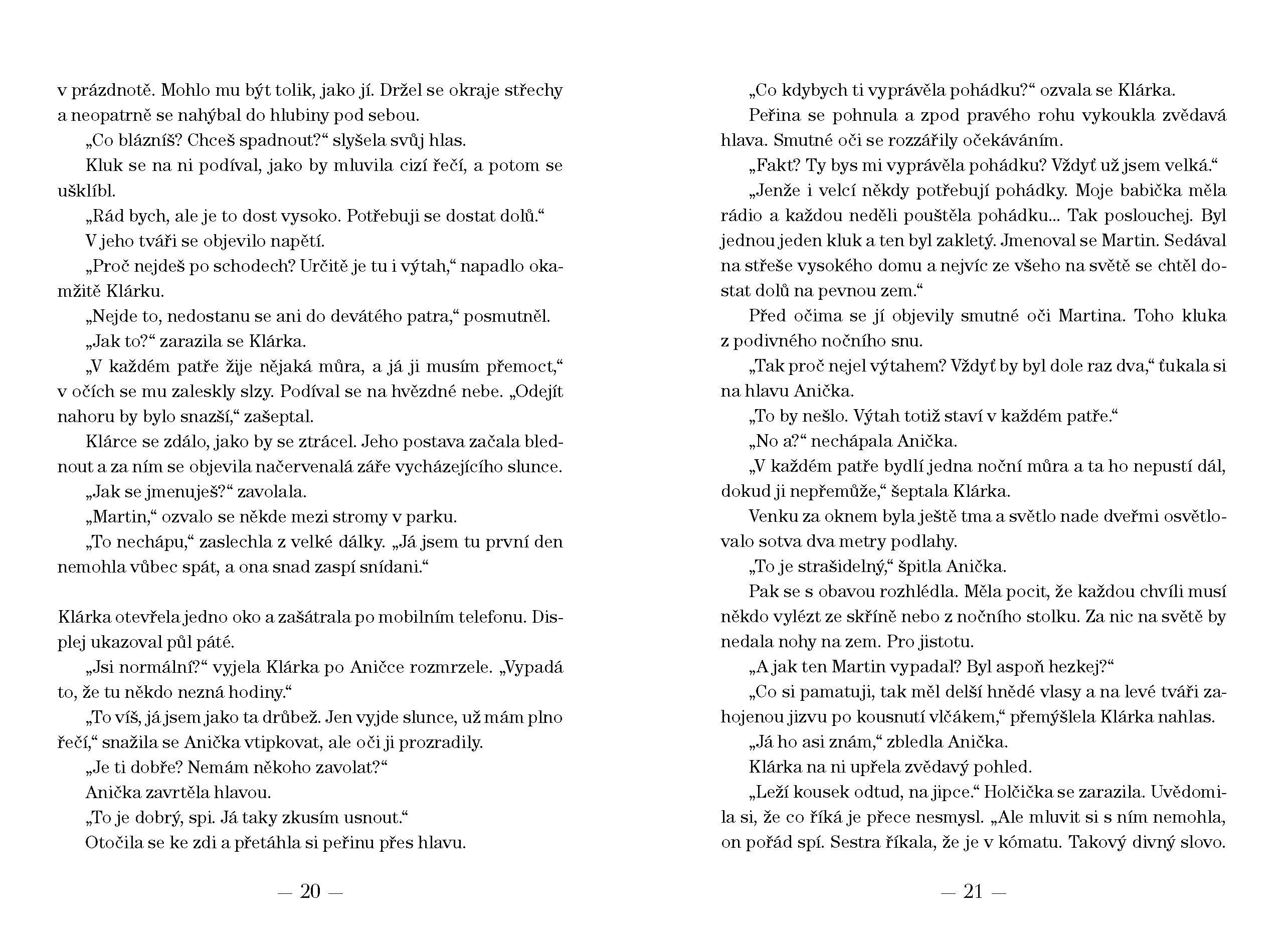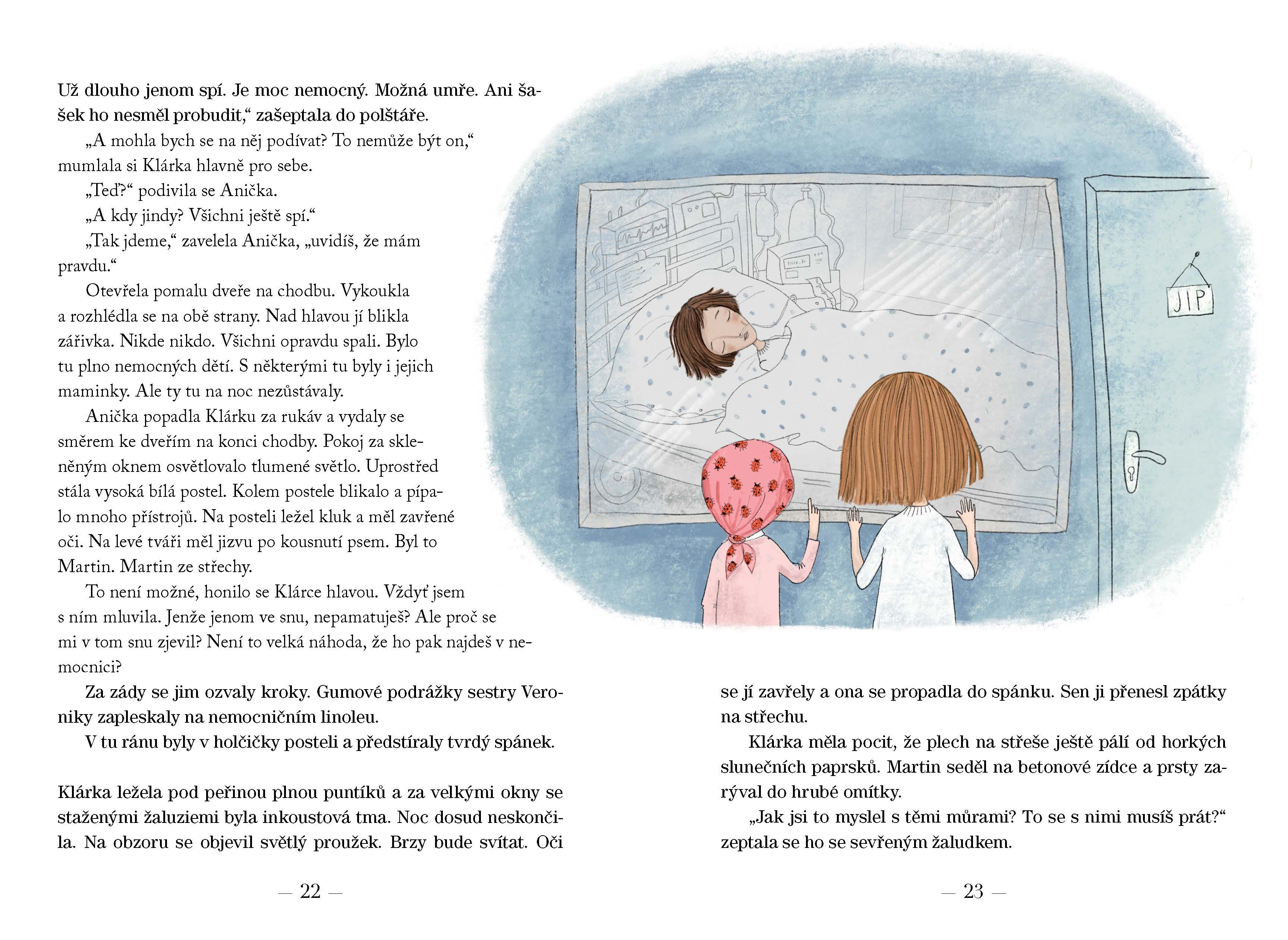 Veselá Klárka, která ráda sní, umí kreslit a vyprávět příběhy, se jednoho letního dne octne v nemocnici s vážnou chorobou. Snaží se nepropadnout smutku, naopak baví Aničku, která je s ní na pokoji a zprvu se na ni šklebí jako opice. Ve snu se Klárka setká s Martinem, a když zjistí, že ho ve skutečnosti srazilo na kole auto a on leží na nedaleké jipce, pomáhá mu k uzdravení. Její pomoc není však obyčejná… Zachrání Klárka kamaráda? A sebe?