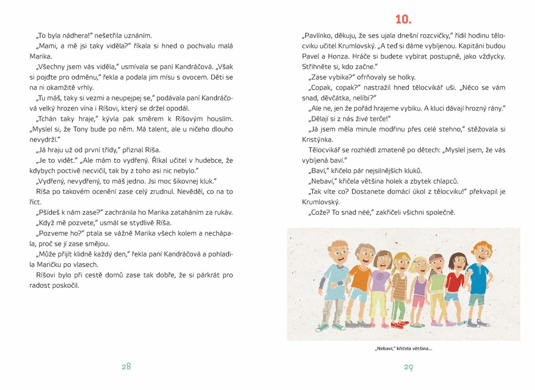 Tony se s velkou rodinou právě přistěhoval do nového města, navíc do domu, ve kterém nejspíš straší. Rád hraje míčové hry, nejraději ze všeho kin ball, týmový sport s velkým balonem. Ríša je Tonyho pravý opak: maminka mu láskyplně říká Otesánku, protože má pár kilo navíc, a spíš než na hřišti byste ho potkali v hudební škole. Přestože jsou každý jiný, rychle se spřátelí. Tony učí Ríšu kin ball a Ríša by byl moc rád, kdyby Tony začal chodit na housle. Jenže je tu háček: kluci nemají druhé housle. Rukopis knihy zvítězil v literární soutěži Albatrosu pro rok 2017 na téma Potkali se ve škole.