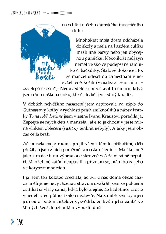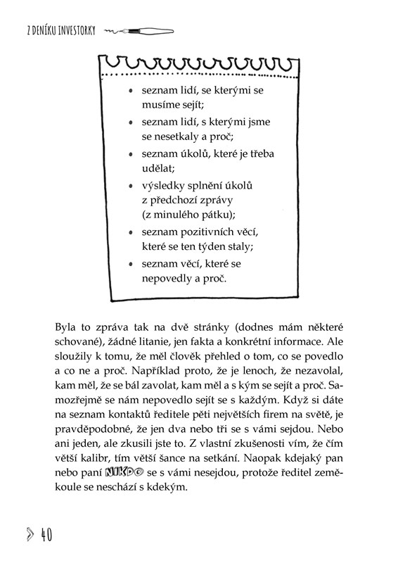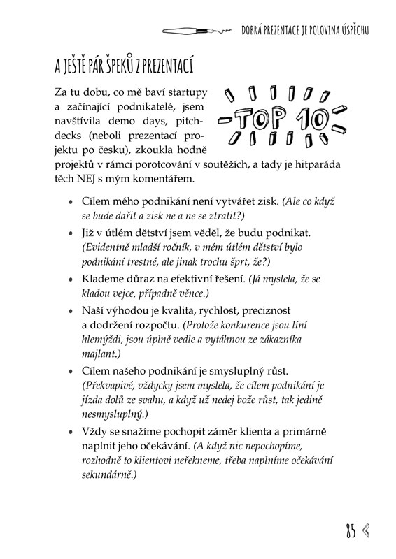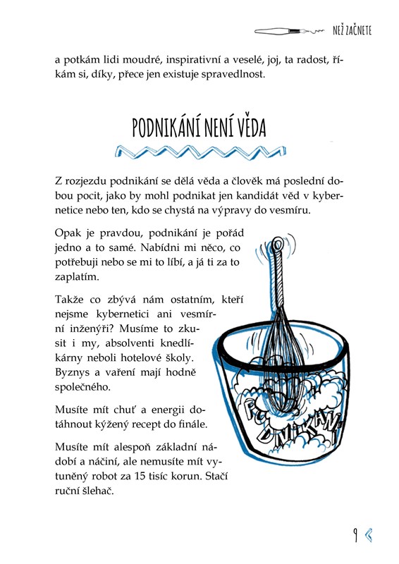 Za 25 let v byznysu jsem zjistila to, co miliony lidí přede mnou. Život je jízda nahoru a dolů. A v podnikání to platí dvojnásob. Nikdy nejste dole tři sta let, ale budete dole dlouho, pokud nezvednete zadek z gauče. V téhle knížce najdete zážitky z mého byznysového života, praktické návody, jak rozjet podnikání, i moje osobní zkušenosti. Dozvíte se, jak se poprat s vyhořením, jak ustát odmítnutí, případně srážku s arogantním blbcem. Naučíte se, že je fajn se radovat i z malých věcí nebo si jen tak tančit v kuchyni, ale i jak vytvořit byznys plán na balicí papír a kde se hledají investoři. Napište dopis vlastnímu strachu a vykročte z komfort zóny – to je to, co se počítá. Dělám to často, ne vždycky se dostaví úspěch, ale žiju.