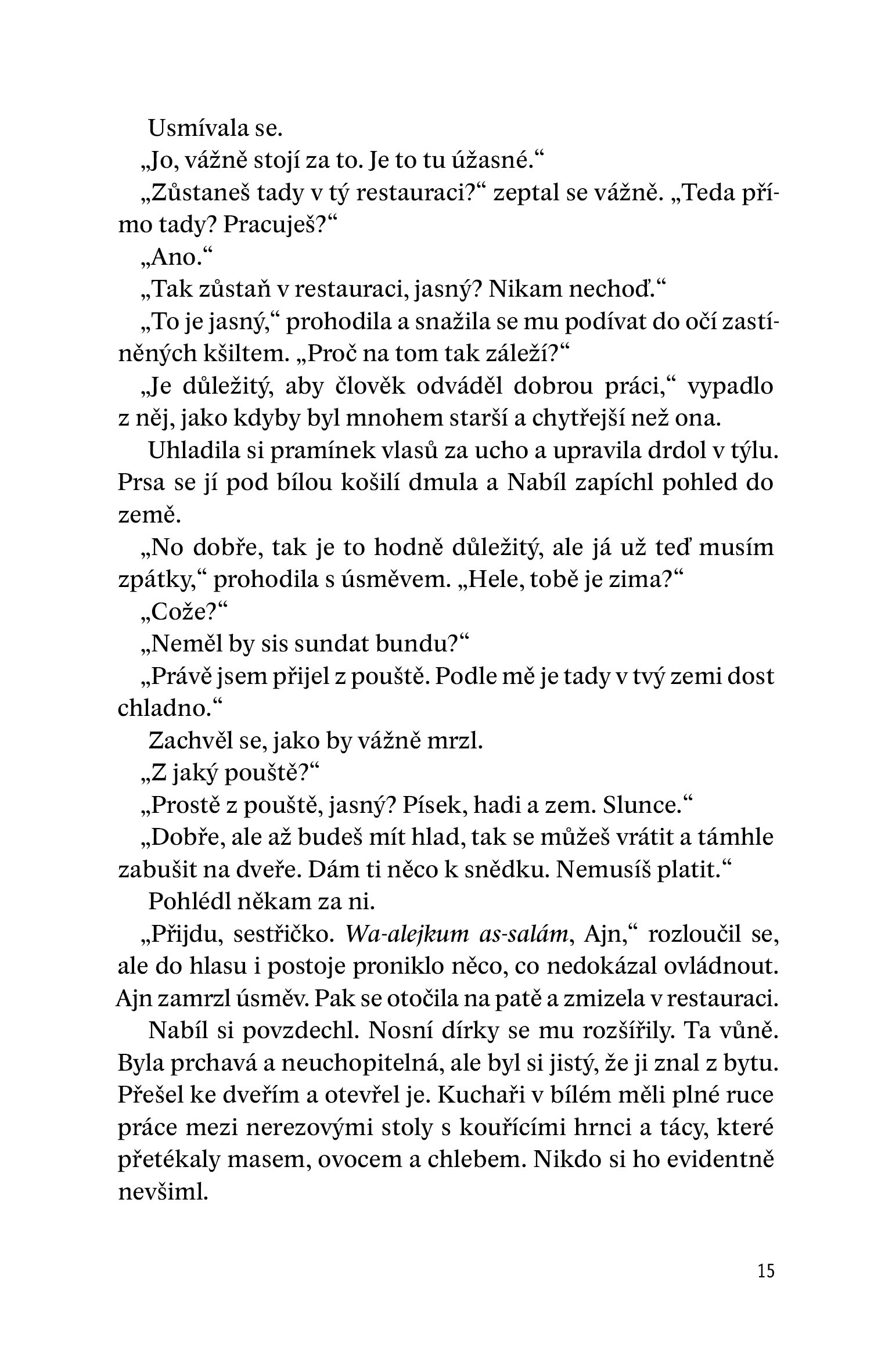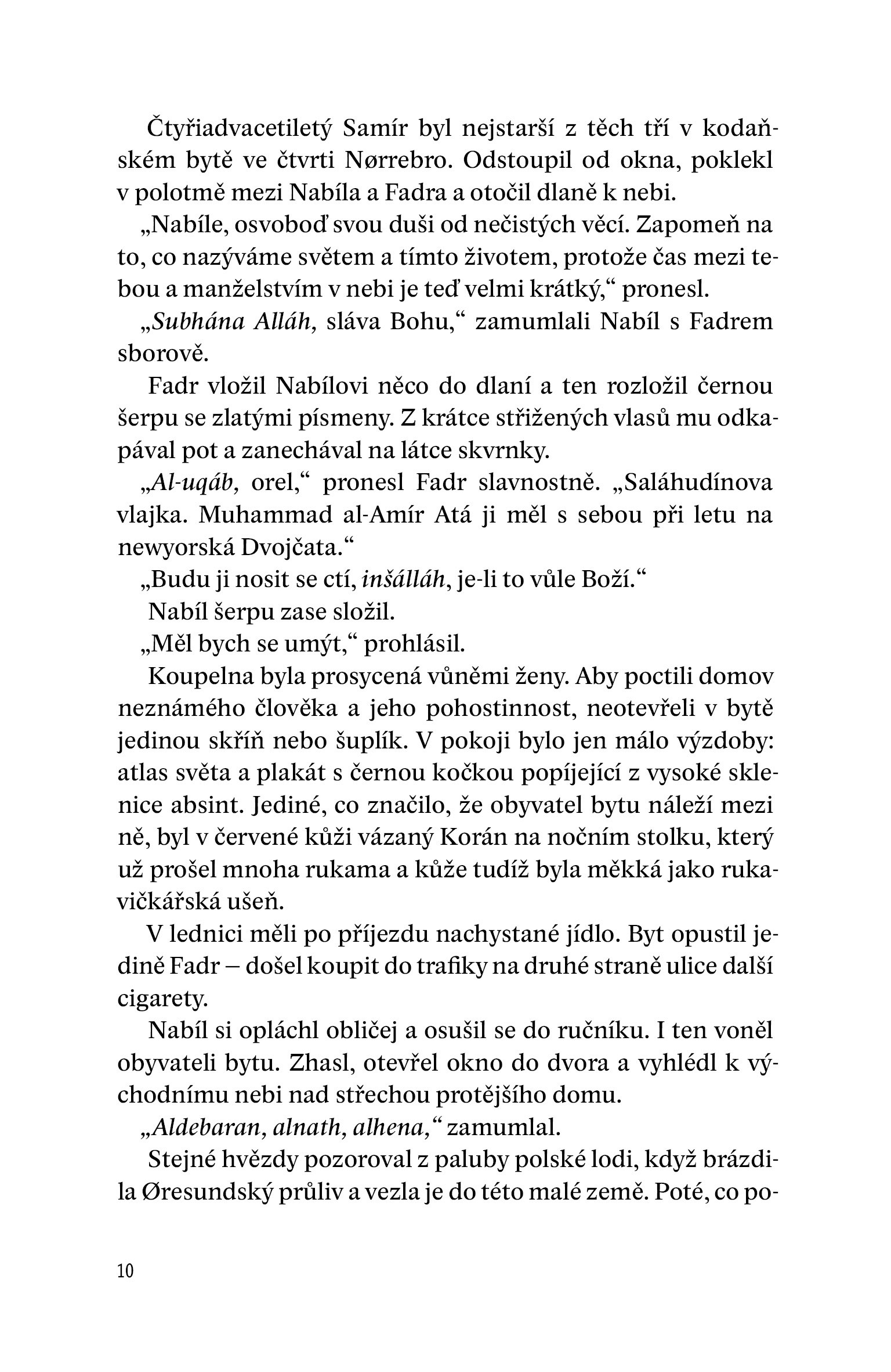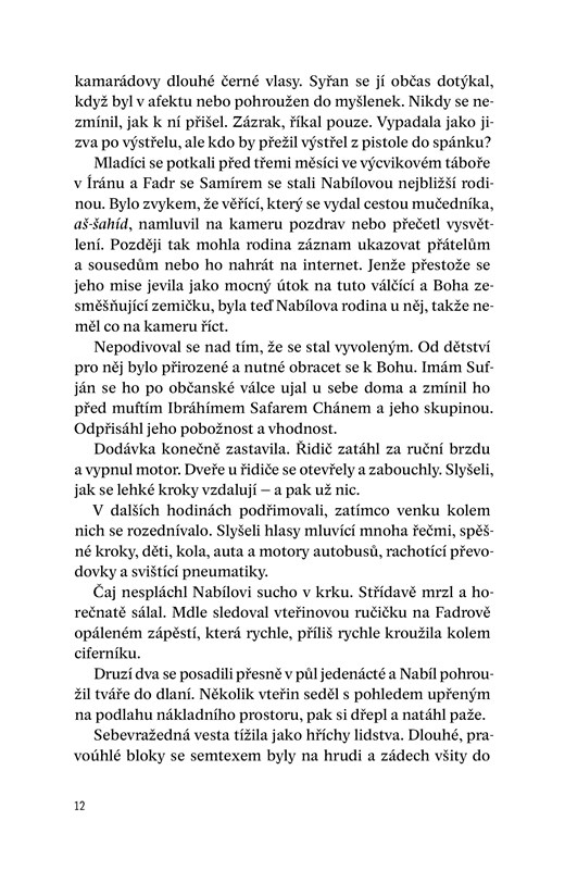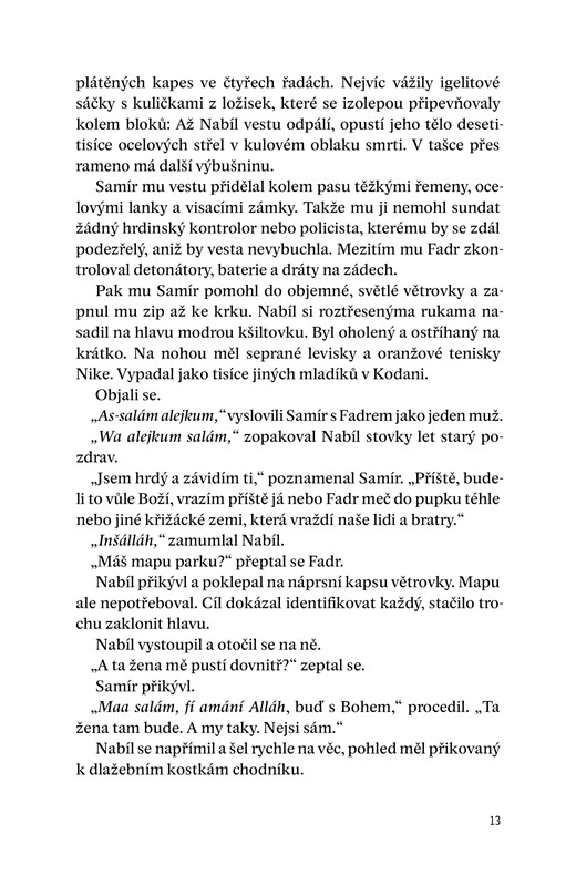 "Sebevražedná vesta tížila jako hříchy lidstva. Obdélnikové bloky se semtexem byly na hrudi a zádech všity do plátěných kapes ve čtyřech řadách. Nejvíc vážily igelitové sáčky s kuličkami z ložisek, které se izolepou připevňovaly kolem bloku. Až Nabíl vestu odpálí, opustí jeho tělo desetitisíce ocelových střel v kulovém oblaku smrti. V tašce přes rameno má další výbušninu. Samír mu vestu připevnil kolem pasu těžkými řemeny, ocelovými lanky a visacími zámky."