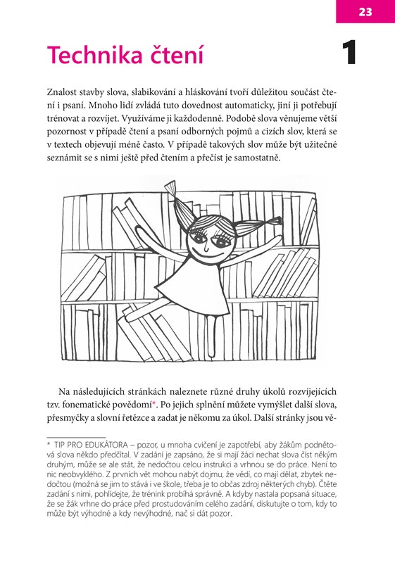 Kvalitní čtenářské dovednosti představují klíč k úspěšné celoživotní vzdělanosti. Kdo nechce přestat s nápravou problémů se čtením ve třetí či čtvrté třídě, sáhne po této publikaci. Obsahuje cvičení a úkoly, které svou náročností odpovídají rozumové vyspělosti dítěte na druhém stupni a současně respektují jeho čtenářské dovednosti. Volba cvičení rovněž odpovídá současným poznatkům o efektivní nápravě poruch čtení.