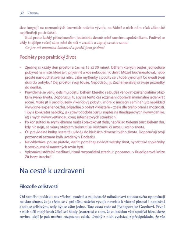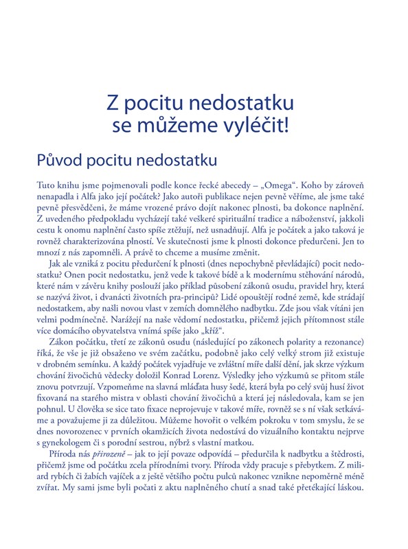 Právě teď nastal čas napravit tento klam a naplno prožít bohatství, a to jak vnitřní, tak vnější, a velkoryse je sdílet se světem! Ruediger Dahlke a Veit Lindau, jedni z nejznámějších duchovních učitelů, v této knize společně píšou o nedostatku povědomí, který činí náš život těžším, který z nás dělá nešťastné a vlastně vnitřně i zevně chudé, který má dokonce i tu zlou moc zničit naše vztahy a učinit nás fyzicky nemocnými. Autoři nám ukazují cestu k procesu, který začíná v našich srdcích a má sílu hluboce transformovat naše životy a učinit z nich místo lásky a štědrosti. A toto je OMEGA - revoluce v našem myšlení a pocitu, v našem vědomí a na našich činnostech.