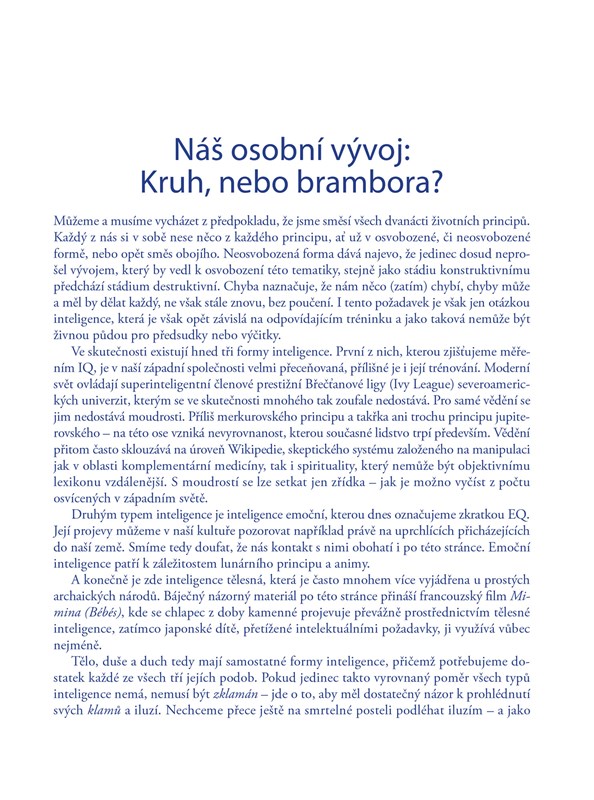 Slova autorů lze pochopit ještě lépe za pomoci vývojového kruhu tvořeného souborem dvanácti pra-principů: Princip Mars–Beran (agrese a vzmach), Venuše–Býk (sebehodnocení, zakořenění, smyslová radost), Merkur–Blíženci (vzájemné sdílení a komunikace), Luna–Rak (citlivost, pochopení, bezpečí, životní rytmus), Slunce–Lev (kreativita, vyzařování, střed), Panna–Merkur (pořádek a rozum), Venuše–Váhy (skryt harmonie bohatství), Pluto–Štír (radikální bohatství), Jupiter–Střelec (růst, nalezení smyslu), Saturn–Kozoroh (vytrvalost), Uran–Vodnář (buřič), Neptun–Ryby (oceán jednoty). Kdo si zvolí uvedenou cestu, bude mít na své straně – jakoby mimochodem – všechny čtyři elementy, tedy vodu, oheň, vzduch a zemi.