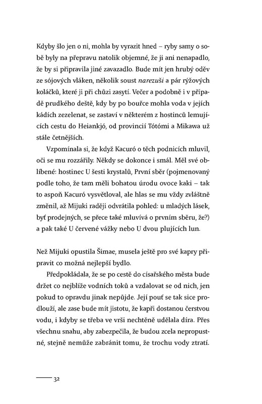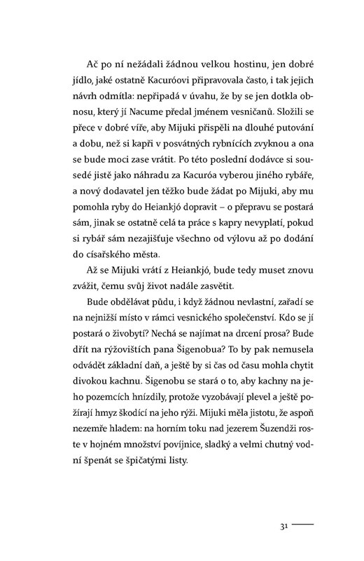 Na březích japonské řeky Kusagawa leží chudá vesnice. Je domovem muže s výjimečným talentem. Rybář Kacuró ovládá umění lovu nesmírně vzácných kaprů, které dodává do dalekého sídelního města. Při jedné výpravě za rybami však Kacuró utone v rozvodněné řece a jediné, co po něm zůstane je poslední úlovek kaprů. Na dalekou a strastiplnou cestu ke dvoru se musí vydat mladá a nezkušená vdova Mijuki. Nikdy dřív nepřekročila hranice vsi a nezná nástrahy světa. V proutěných koších nese těžký náklad ryb a netuší, co ji čeká... Vytříbená kultura i surovost, pohádkový luxus i otřesná chudoba, to jsou dvě tváře Japonska z doby 12. století. Jeden z recenzentů o tomto místy drsném, místy vysoce smyslném románu napsal: „Tenhle román je tvořen řadou literárních zázraků, díky nimž se bahno proměňuje ve zlato.“ Do češtiny jej přeložila Jovanka Šotolová.