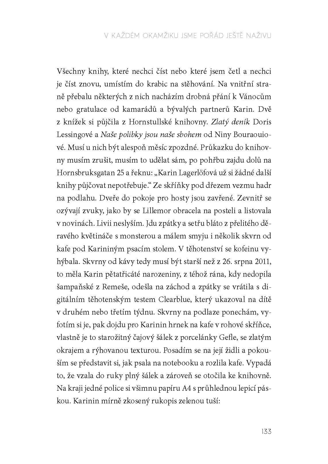 Než je Karin uvedena do umělého spánku, Tom jí slíbí, že pro ni průběh událostí zaznamená. Malmquist se zároveň retrospektivně vrací ke svému seznámení s Karin, rozebírá její vztah s rodiči a neschopnost se od nich oddělit a žít vlastní dospělý život. Vypráví o jejich lásce a o společném životě před těhotenstvím, o oslavách silvestra se stárnoucími rodiči, o klíčových situacích v Tomově dětství, otcově alkoholismu a matčině obtížnému rozhodování, zda manžela opustit.