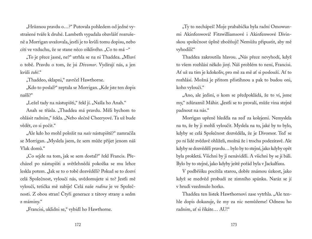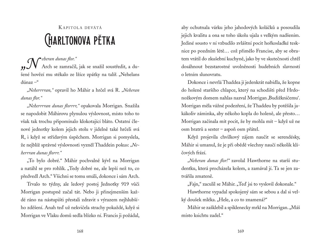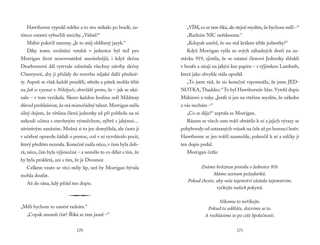 Morrigan sice zlomila svou smrtící kletbu a vykonala nebezpečné zkoušky, ale její cesta k Nikdyuši a všem jeho tajemstvím teprve začala. A ona rychle zjišťuje, že ne všechna magie se využívá pro dobrou věc. Morrigan dostala pozvání vstoupit do Divinské společnosti, která jí slibovala přátelství a ochranu, ale kdosi ji a její společníky vydírá, takže i těch pár věrných přátel se obrací proti ní. Zbaví se Morrigan někdy svého prokletí?
