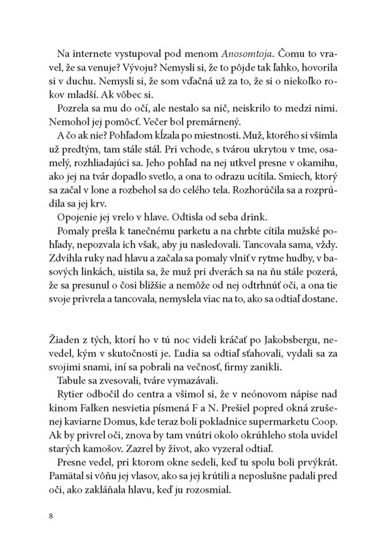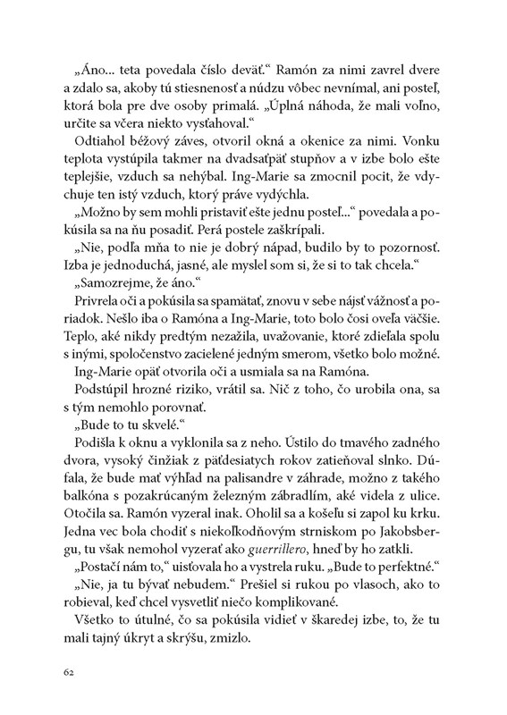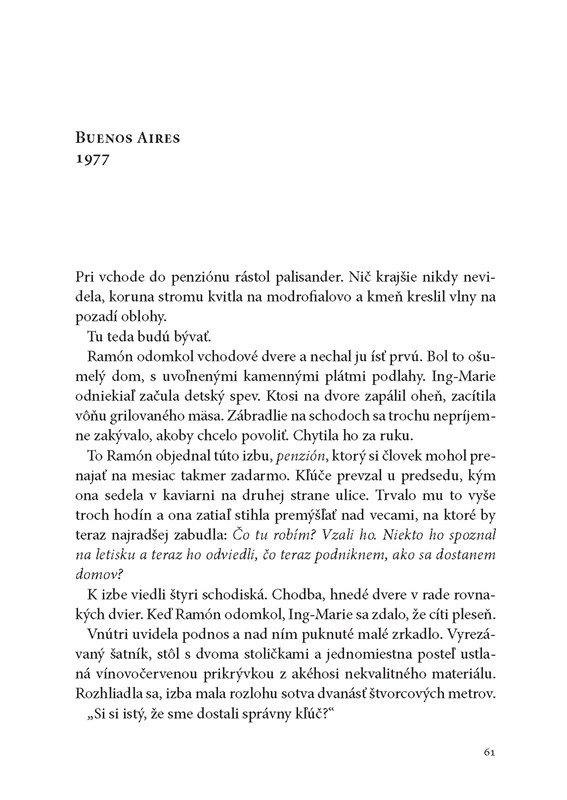 "Možnože, keď príde na koniec Brazílie, nájde nejakú cestu von, ak ju, pravdaže, nezadržia alebo nezavraždia. Počas dlhých roztrasených ciest autobusom a v šoférskych kabínach rozmýšľala, koho by v takom prípade vyhlásili za mŕtvu. Claudiu Viehhauserovú alebo Ing-Marie Sahlinovú? Mala pocit, že Ing-Marie viac neexistuje, možno nejestvovala ani v tú noc na rieke. Ostala v hotelovej izbe v La Boca, odsúdená naveky sa vracať k tomu istému okamihu, ku chvíli, keď si uvedomila, že ten, koho miluje, neexistuje, že nie je tým, za koho ho považuje." (str. 280)