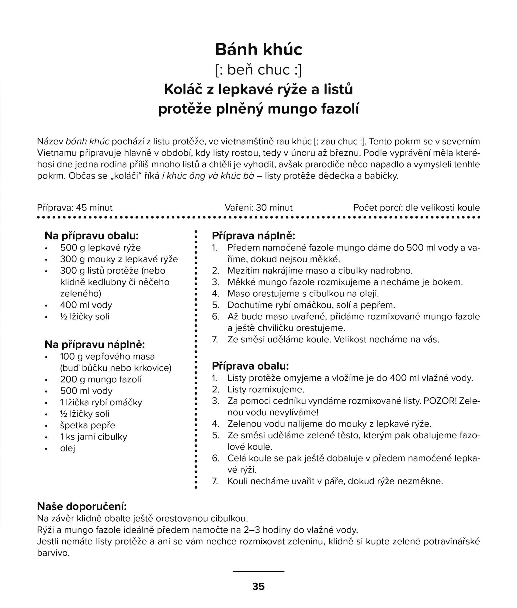 Uvařte si vietnamské speciality přímo u vás doma. Autoři, kteří vás povedou krok za krokem, jsou z těch nejpovolanějších – jedná se totiž o představitele druhé generace Vietnamců žijících v Česku. Podělí se s vámi o tipy a triky svých babiček, objasní vám původ jednotlivých jídel a jejich symbolický význam a upozorní vás na všechna možná úskalí přípravy oblíbených pokrmů. Ohromte své přátele a jejich chuťové buňky a připravte neopakovatelnou vietnamskou hostinu, na kterou budou všichni ještě dlouho vzpomínat.