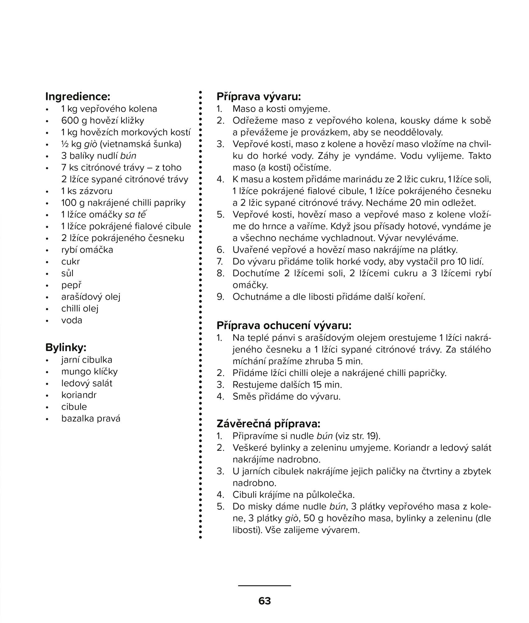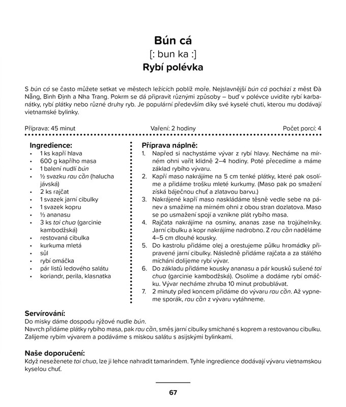 Zajímavosti ze světa vietnamské kuchyně, představení tradičních vietnamských surovin a tipy na jejich nakupování, doporučení na vietnamské podniky v České republice, tipy na gastro výlety ve Vietnamu, ale hlavně obrovská nálož receptů.