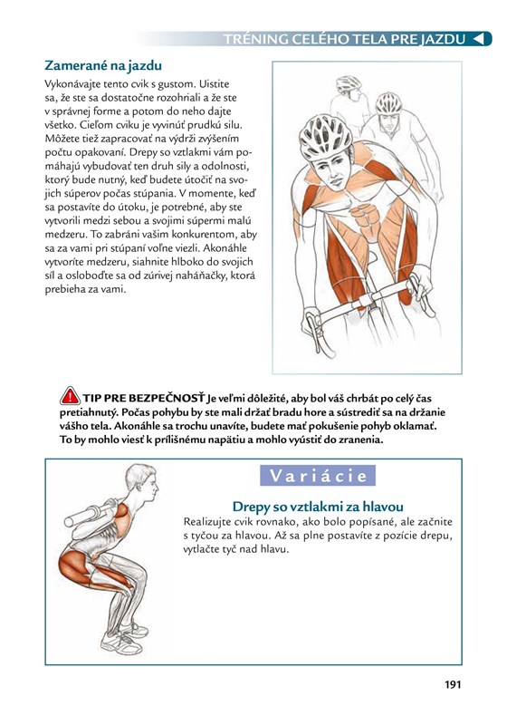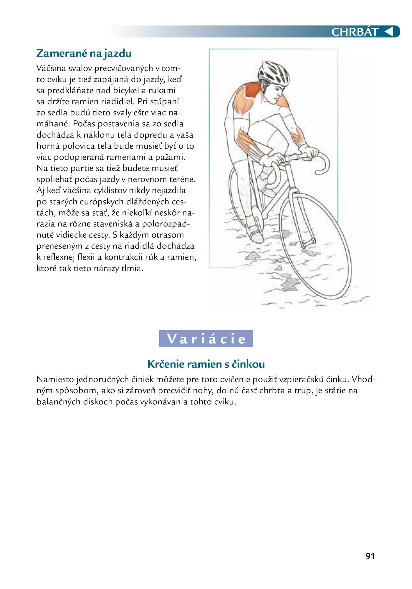 Celkovo 74 najúčinnejších cvičení pre jazdu na bicykli, každé s jasným, postupným popisom a farebnými anatomickými ilustráciami, ktoré zobrazujú svaly práve zapojené do určitého pohybu. Jednotlivé cviky sa aplikujú priamo na situáciu pri jazde a pri urputných bojoch počas súťaží. Zobrazené pracujúce svaly počas zatáčania, stúpania, klesania a šprintu ukazujú, ako jednotlivé cviky zásadne súvisia s cyklistickým výkonom. Naučíte sa tiež pozmeniť cvičenie tak, aby ste sa zamerali na určité svalové oblasti, znížili svalové napätie a minimalizovali tak vznik bežných cyklistických úrazov.