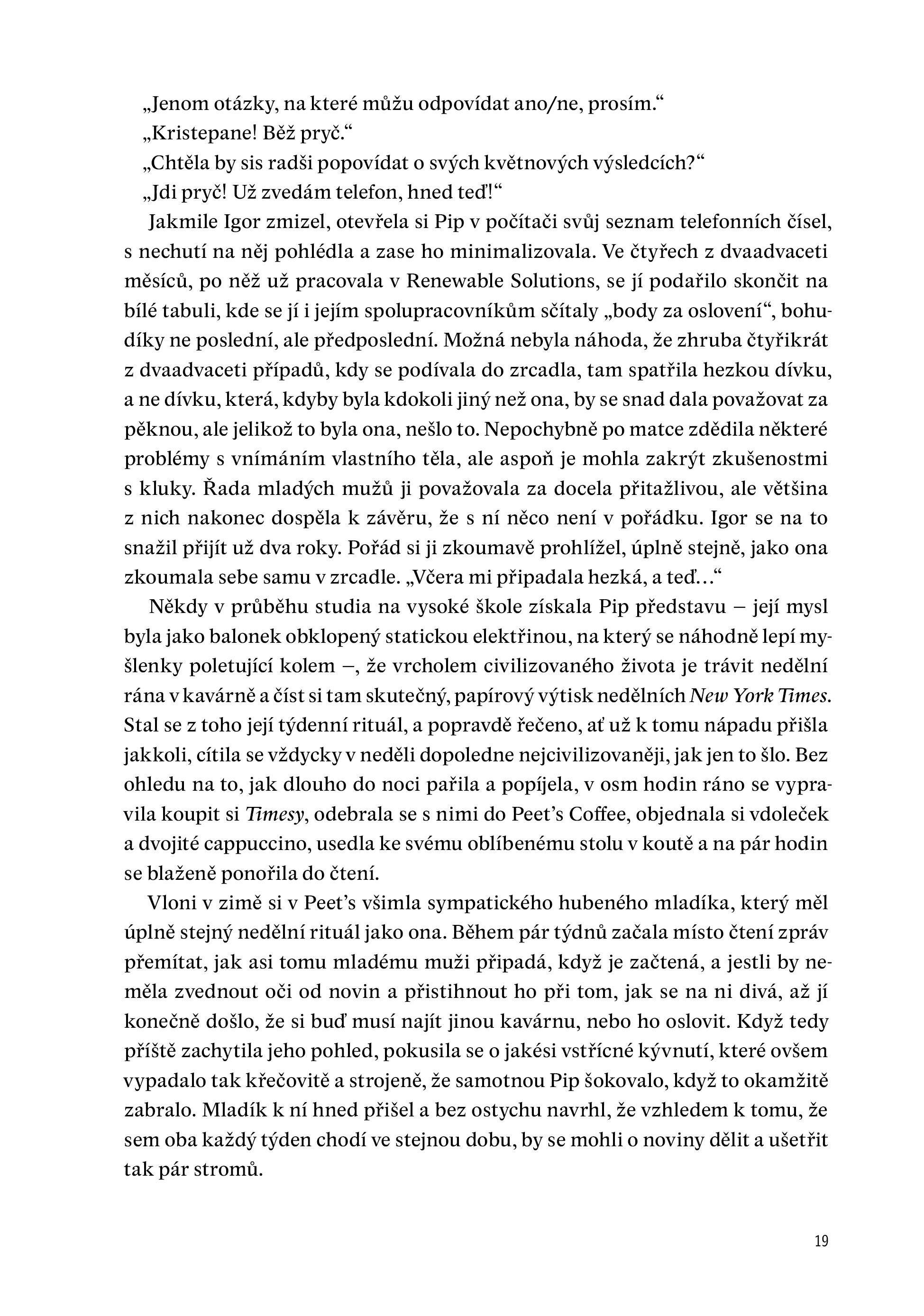 Pip Tylerová má neuspokojivou, špatně placenou práci, bydlí v anarchistickém squatu, splácí obrovskou studentskou půjčku a nemá tušení, kdo vlastně je. Ví, že se ve skutečnosti jmenuje Purity, ale matka jí odmítá prozradit totožnost jejího otce i své vlastní pravé jméno, dokonce jí nechce ani říct, kdy se narodila. Andreas Wolf je charismatický provokatér původem z bývalého východního Německa, který založil v Bolívii organizaci podobnou WikiLeaks. Leila Helouová je americká novinářka libanonského původu provdaná za stárnoucího invalidního spisovatele. Pracuje pro internetový deník, jehož provozovatelem a majitelem je Tom Aberant – Leilin milenec.