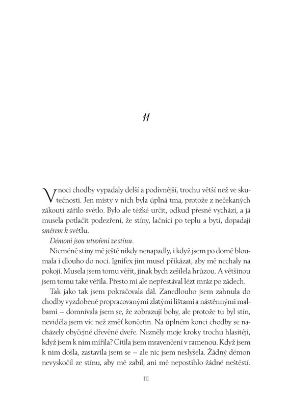 Postavy sa mi páčili. Nyx nebola hlúpa, bola reálna a úplne normálna, nič nepreháňala, jednoducho konala ako to jej charakteru prirodzene sedelo. Ignefix (netvor) bol zatrpknutý pán démonov a tiež naňho jeho správanie dokonale sedelo. Protivný úškľabok, nič nesilil a odkrýval nepredvídateľné. Obľúbila som si ich oboch. Menej som však fandila jeho tieňu, o ktorom som netušila, čo si mám myslieť. Sústredila som sa na Ignefixa a nie na tieň, ktorý som netušila, čo tam robil, ale postupne sa mi situácia vyjasňovala, no aj tak som nadržiavala netvorovi. Rozprávková predstava, nič viac. Postavy však pôsobia sympaticky a neprikrášlene. Je jasné, že ich negatívny charakter nie je v ničom príjemný, no keď vidíte tie okolnosti, ktoré ich formovali, hneď viete, kde je problém a prečo sa správajú práve tak. Neboli čestní, ale plní jedu a nenávisti, a možno práve to ich tak dokonale spájalo.