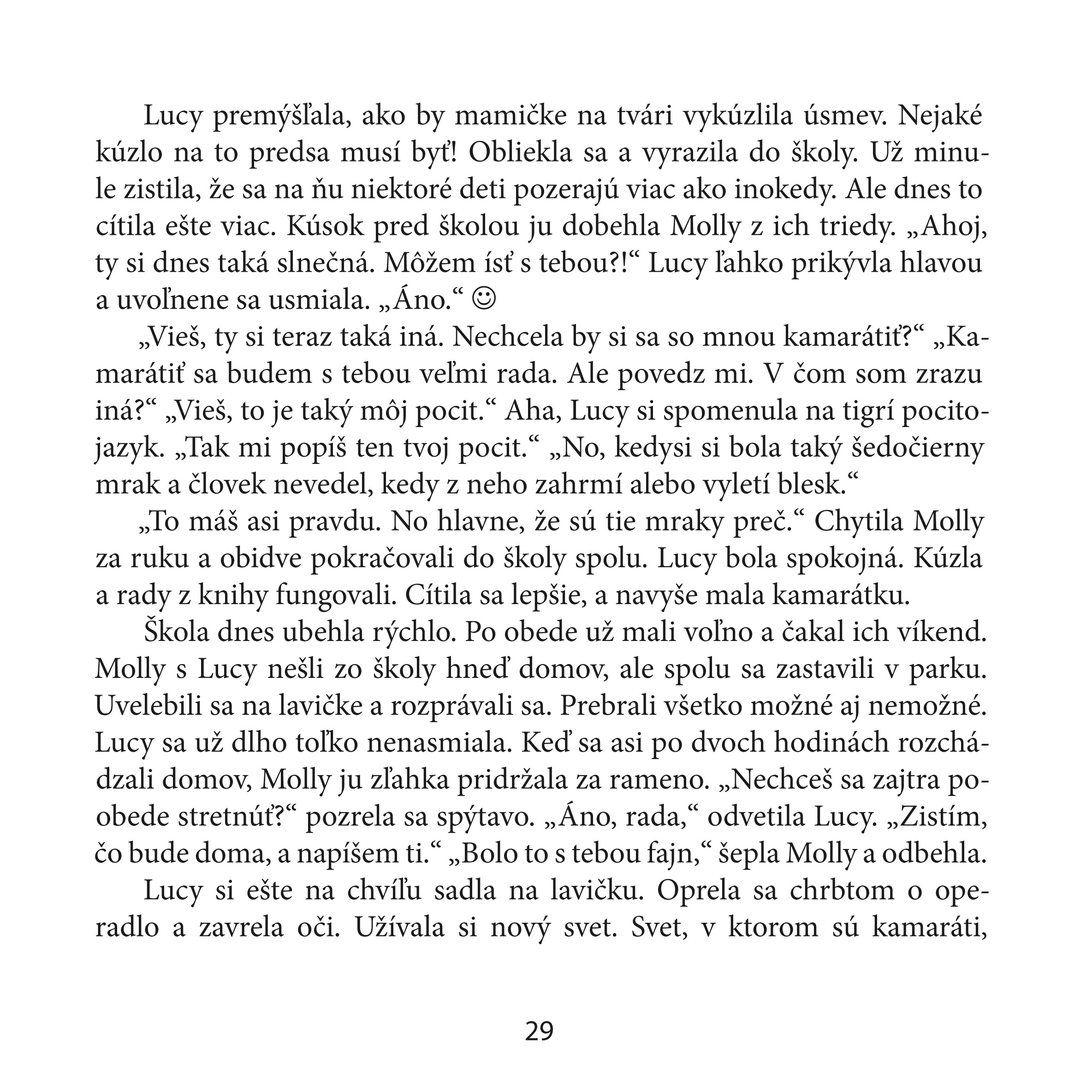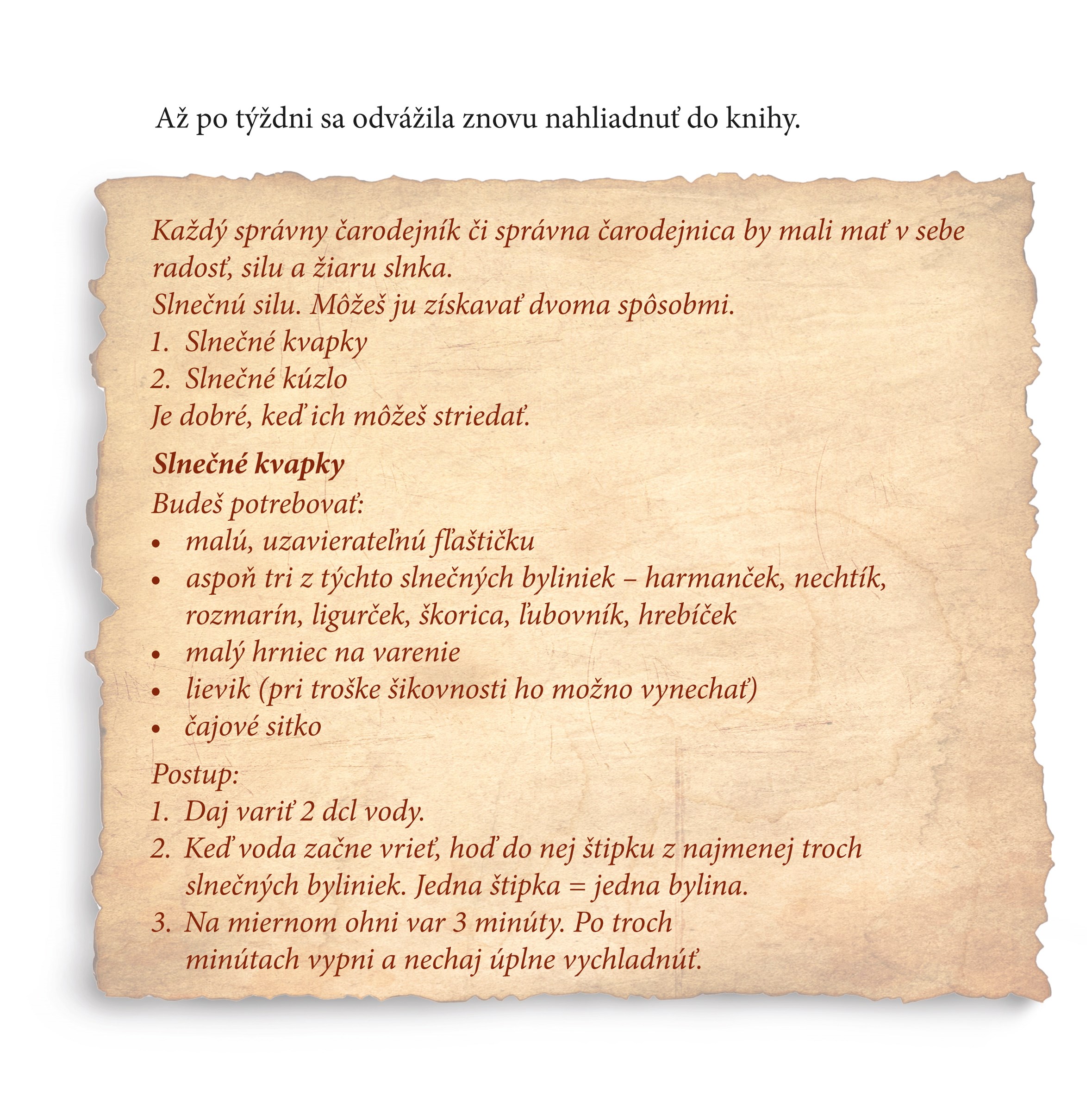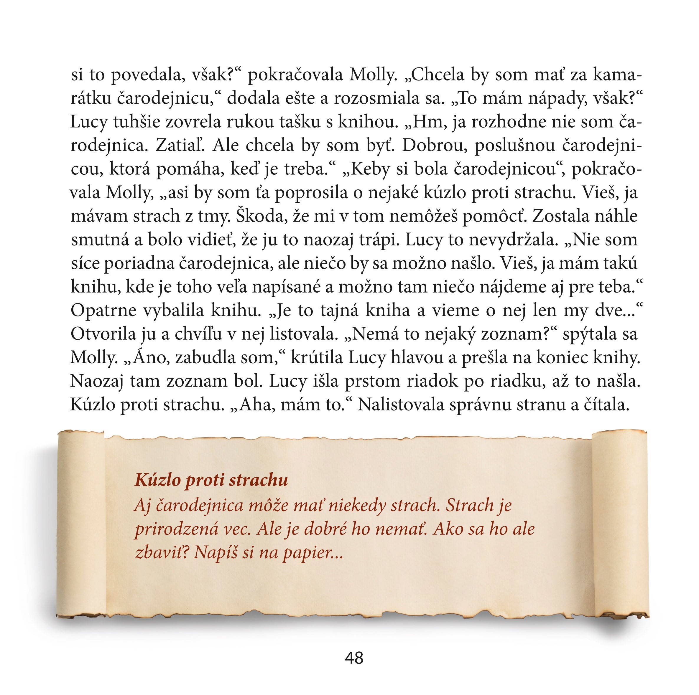 Svet je plný kúziel. Niekedy tých tajuplných, inokedy až jednoducho obyčajných. Všetky ale majú jedno spoločné. Neuveriteľne fungujú a môže ich zažiť každý z nás. Nepotrebujeme na to ani čarovné krajiny, ani pomoc mocných čarodejníkov. Stačí vnímať svet okolo nás, objavovať ho a chcieť niečo zmeniť... V knihe si prečítate príbeh Lucy, ktorá sa ničím nelíši od tisícov ďalších chlapcov a dievčat. Jedného dňa však objaví na pôjde starú Knihu kúziel. Spolu s Lucy zažijete dobrodružstvá a objavíte kúzla zo starodávnej knihy, napríklad: ako pričarovať kamarátov, ako vykúzliť mamičke úsmev, ako si vyrobiť Slnečné kvapky na lepšiu náladu, ako zvládnuť skúšku, ako sa zbaviť strachu. Vstúpte do sveta kúziel a objavte to pravé kúzlo pre seba!