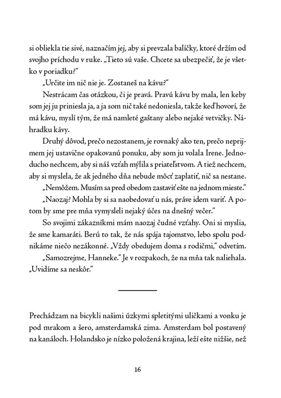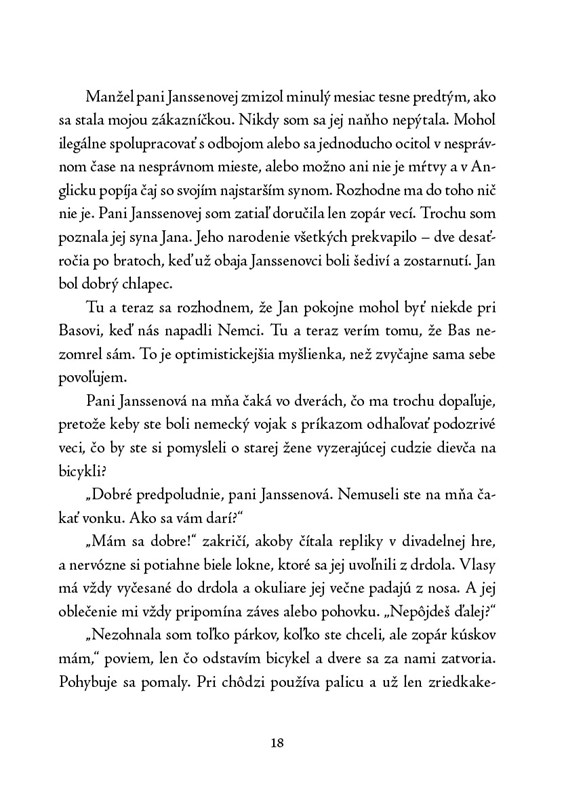 Práve takýto príbeh ponúka táto knižka. Priamo z Amsterdamu. Tento príbeh rozpráva dievča menom Hanneke. Nežije zas až taký poctivý život, no je mladá a robí, čo najviac môže, aby pomohla svojej rodine. Oficiálne robí v pohrebníctve menšie administratívne veci, no jej hlavnou zárobkovou činnosťou je rozvážaťpodpultový tovar a zháňať veci, ktoré sa už v tej dobre tak ľahko kúpiť nedali. Práve týmto spôsobom sa raz ocitne na návšteve u zákazníčky, ktorá ju požiada o veľmi zvláštnu vec. Nájsť dievča, ktoré utieklo pred vojakmi, ktorí zabili jej rodinu. Mnohí sa skrývali a nevedno, ako sa ich životy skončili, keď skončila knižka, keď skončila vojna.