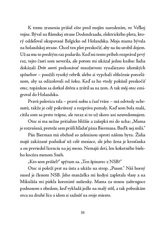 Táto knižka nie je o strachu, bolesti, skrývaní, čučaní, či odboji. Je o láske, priateľstve, odhodlaní niečo urobiť a o odvahe niečo aj reálne urobiť. Hanneke často rozpráva o svojom mŕtvom priateľovi, ktorý odišiel brániť krajinu, no zahynul. Často naňho myslí a nedá sa zabudnúť, pretože sa jej do cesty pripletie jej brat. Čaká ju nemálo ťažkých a nebezpečných rozhodnutí, no aj napriek tomu obstojí, aj keď so smutným koncom. Ale také asi sú tieto príbehy, o smutnom osude tohoto obdobia.