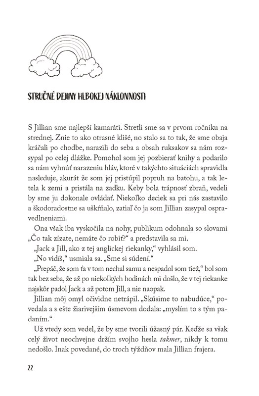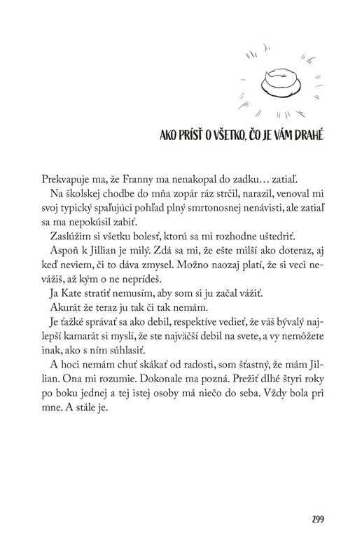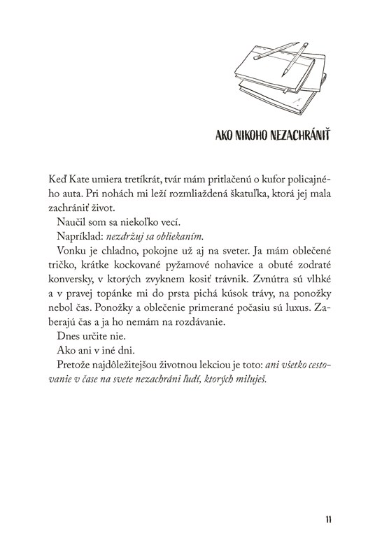 Nerada porovnávam, ale túto knihu si obľúbia milovníci Johna Greena alebo knihy Kým vychladne káva. Hlavná postava sympatický Jack, ktorý je celoživotný smoliar. Jeho život je poskladaný zo slova takmer. Takmer sa stal skejterom, takmer sa pridal do futbalového tímu, takmer vyznal lásku najúžasnejšej babe, akú pozná. Potom stretne Kate a zisťuje, že je tá pravá. Mesiace plynú a Jack s Kate objavujú pravú lásku. A boli by žili šťastne, ibaže Kate zomrie. A Jack dostáva šancu vrátiť sa v čase a pomôcť svoju lásku zachrániť. Podarí sa mu a šancu využije? A čo ak zbabre viac ako na začiatku?