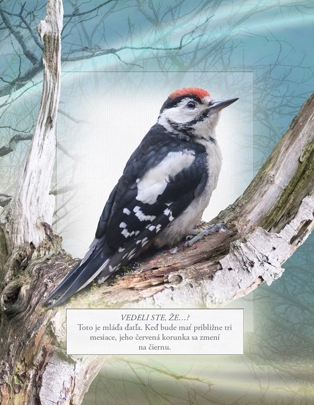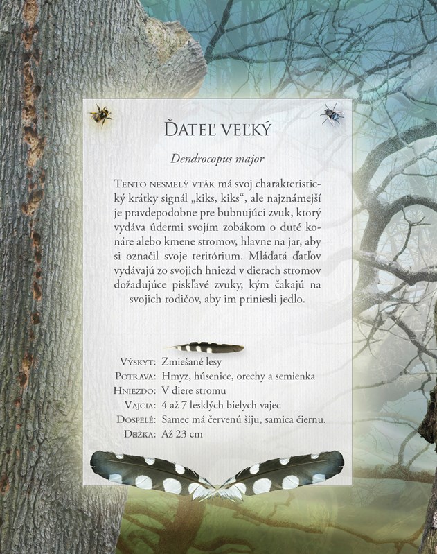 Pozadie každej dvojstrany je vlastne fotka prirodzeného prostredia, v ktorom vták žije.