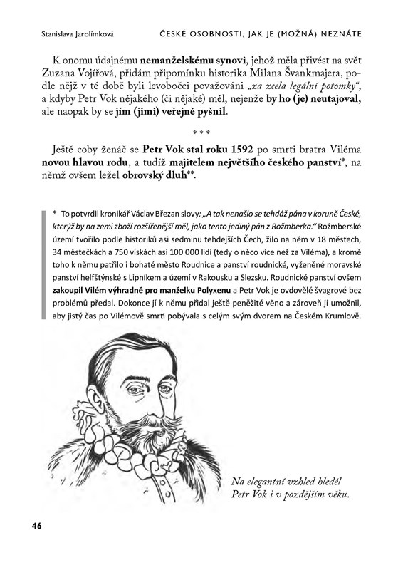 Víte, že Jan Hus nezavedl přijímání podobojí a jeho statečnost na popravišti vysoce ocenil historiograf a budoucí papež Piccolomini? A o pověst Petra Voka jako bonvivána se přičinil řadu let po jeho smrti třeboňský purkmistr kvůli jeho sympatiím k jednotě bratrské? Víte, že Antonín Langweil zachytil na svém slavném modelu Prahy i detaily jako jezírko ve Valdštejnské zahradě „imitované“ zrcátkem či žebřík přistavený k oknu jisté povětrné ženy a že K. H. Mácha chodíval Prahou v bělavém plášti s červenou podšívkou, ve vysokých botách a s bičíkem? Že autor hudby naší české hymny František Škroup byl prvotřídní kapelník, jehož z vlasti vyhnaly pletichy, a Eduard Štorch učitel, který prodal svoji milovanou archeologickou sbírku Národnímu muzeu (za cenu čtvrtky krávy), aby mohl pro své žáky zřídit první školu v přírodě?