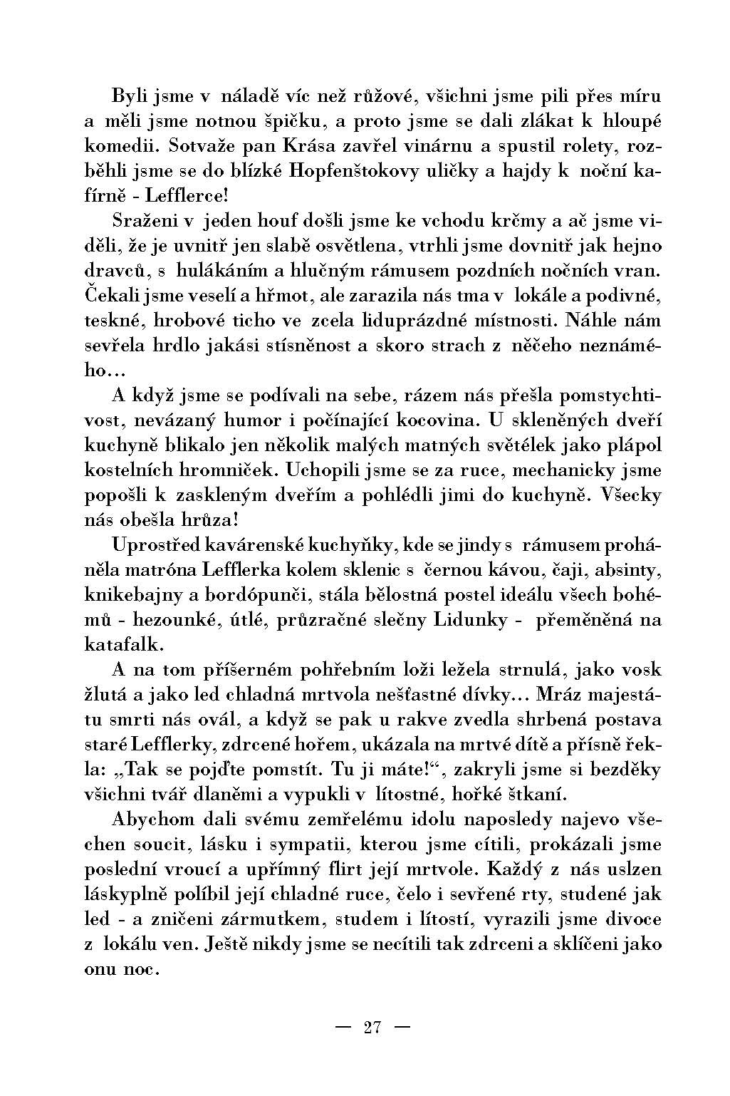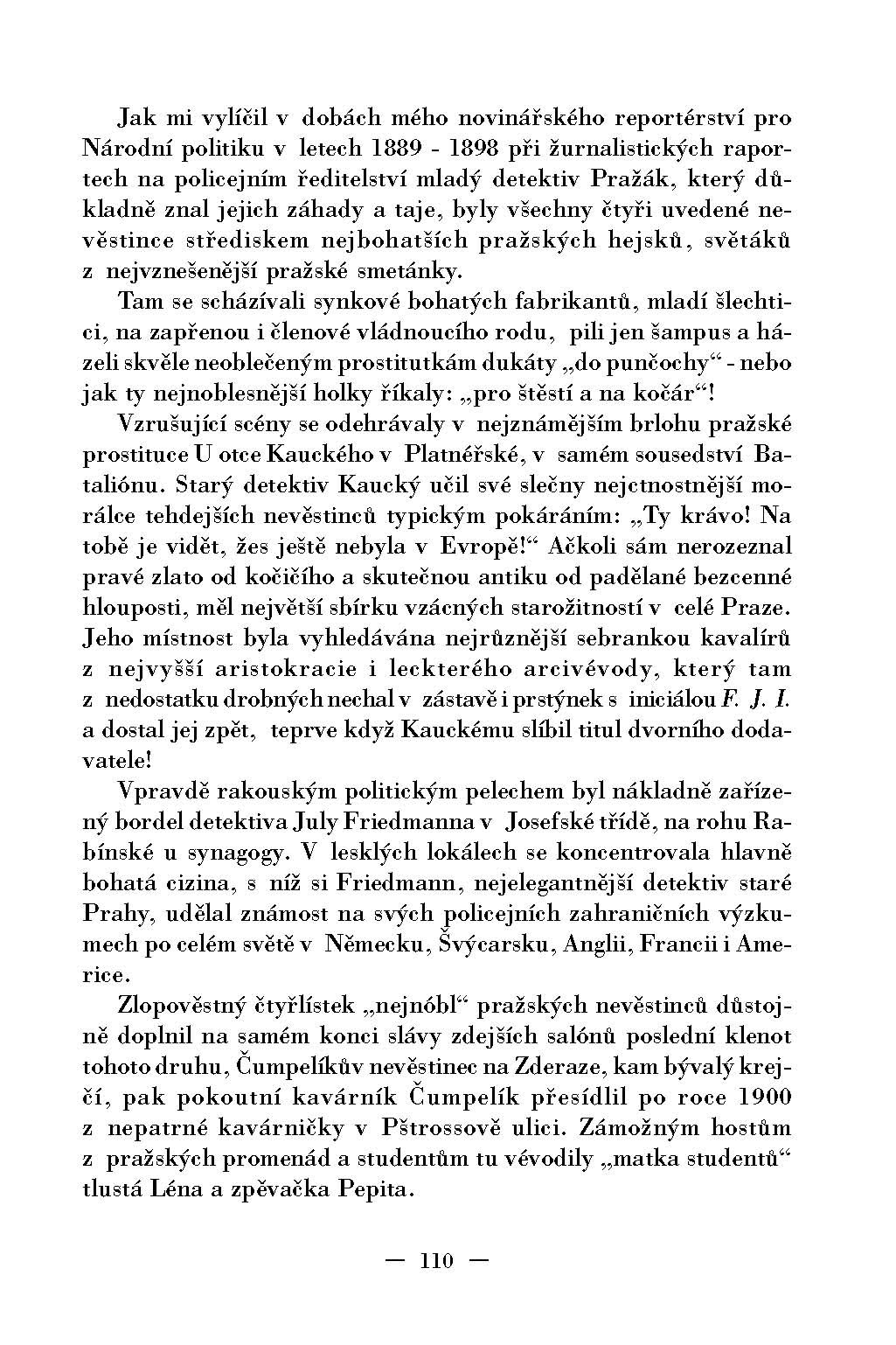 Co také patří k dějinám Prahy před sto lety? Historky z prostředí hospod, náleven, nevěstinců, barů a tančíren nezaměnitelných jmen: Zelená žába, Žbluňk, Jedová chýše. Příběhy z Černé Indie, Hotelu Díra nebo polepšovny. Osudy lidí, kteří žili na společenské periferii a nebyli jen figurkami: Papka-Kaprál, Lojza Rasík, Démon Jana, Tonka-Myš fórová. Osobní svědectví o pěti desetiletích na přelomu 19. a 20. století podává reportér Národní politiky, nejčtenějšího českého deníku té doby, Karel Ladislav Kukla.
