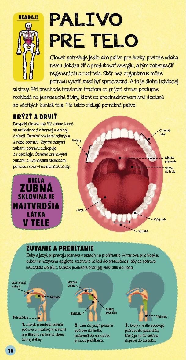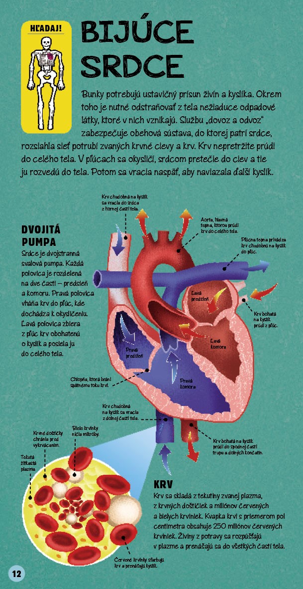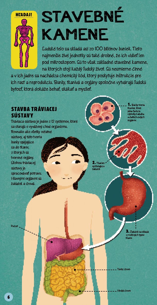 Nebudem vám klamať, kniha Postav si ľudské telo zaujme hlavne modelom kostry, ktorý si môžete sami postaviť. Má ale čo ponúknuť po obsahovej stránke? Snažila som sa zistiť, čo a v akom rozsahu sa učí na základných školách o ľudskom tele. V podstate sa začína v 4. ročníku na prírodovede niektorými sústavami a pokračuje až v 7. ročníku podrobnejšie. Kniha je vydavateľom odporúčaná od 7 rokov.