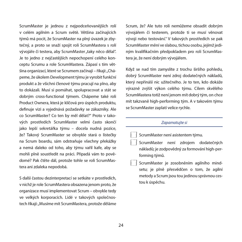 Průvodce pro všechny ScrumMastery, agilní kouče a leadery, kteří chtějí transformovat svoje organizace. Příručka obsahuje všechny možné koncepty, kterým by měl rozumět každý ScrumMaster, a nasměruje vás ke zdrojům, které by vám mohly pomoct při řešení obtížných situací. Kniha je skvělým výchozím bodem při hledání dalších kroků na cestě stát se skvělým ScrumMasterem.
