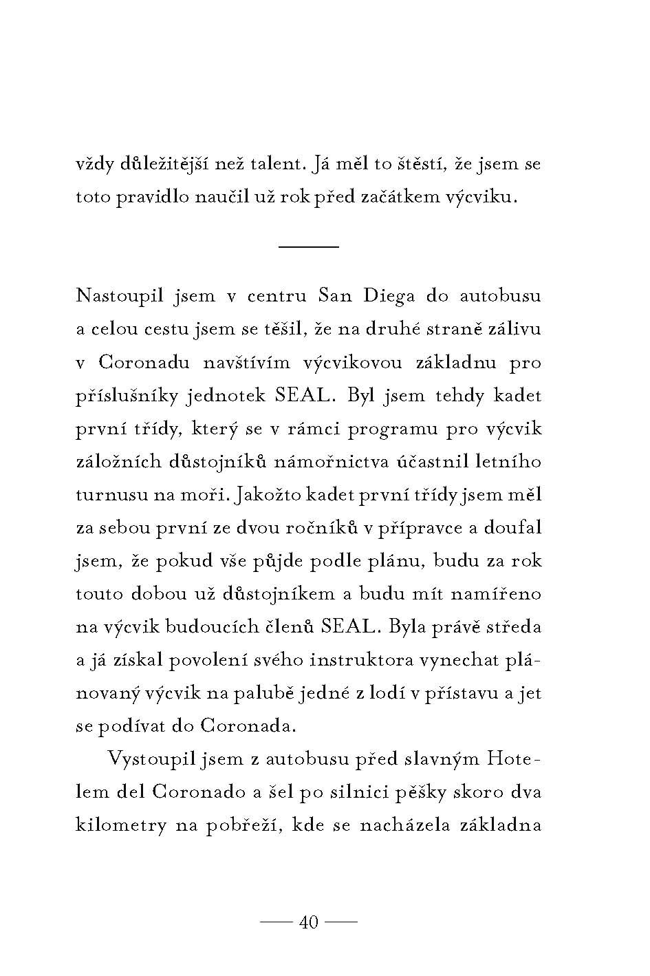 William H. McRaven, penzionovaný admirál námořnictva Spojených států, má za sebou velmi úspěšnou službu v ozbrojených silách USA. Třicet sedm let byl příslušníkem zvláštních jednotek SEAL, kde velel na všech úrovních. Stal se čtyřhvězdičkovým admirálem a jeho posledním pověřením bylo vrchní velení nad všemi zvláštními jednotkami armády Spojených států. V této knize předkládá čtenářům deset pravidel, které se naučil při výcviku jednotek SEAL – výcviku, který patří k těm nejtěžším na světě. Obnáší půlnoční plavání v chladných vodách u San Diega, překážkové dráhy, nekonečné posilování a dlouhé dny bez spánku. Je to něco podobného, jako kdybyste vzali všechny výzvy, jímž musí člověk čelit za celý život, a koncentrovali je do šesti měsíců.