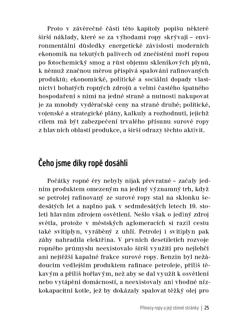 Bez ropy by nebylo globalizace, plastů, běžné přepravy ani světové politické mapy, v níž by se alespoň někdo vyznal. Je to životadárná tekutina moderního světa a zdá se, že ze závislosti na ní se lidstvo ještě hezkých pár desetiletí nevymaní. Autor uznávané Energie v této aktuální knize vysvětluje vše, co s „černým zlatem“ souvisí, od jeho objevení v hlubinách Země až po politické turbulence, které dnes rozpoutává.