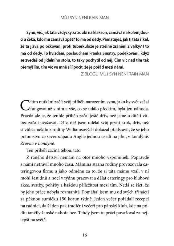 Autor: No, spíš je to takový můj pokus sdílet s vámi radosti a strasti našeho každodenního života. Rád bych, abyste mého syna poznali a trošku více nám porozuměli. Chtěl bych, aby i on jednou dostal šanci na pořádný život.