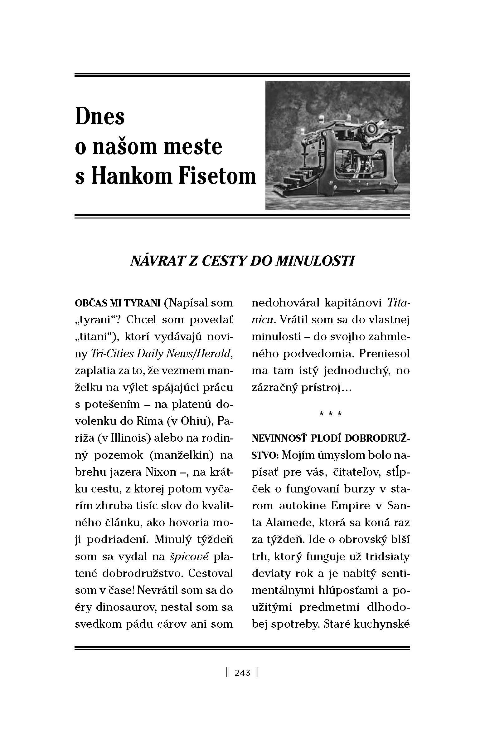 Do čítania som sa púšťala opatrne, bez nejakých väčších očakávaní, hoci už informácia v medailóniku na obálke, že Hanks svoje texty publikoval v časopisoch Vanity Fair či New Yorker, vo mne vzbudila mierne tušenie, že toto čítanie určite nebude márne. Tom Hanks vo veľkom obľubuje a zbiera písacie stroje, ktoré vystupujú v každej jednej poviedke knihy. Vôbec som netušila, čo si pod tým predstaviť či ako ich tam zakomponoval tak, aby to nebilo do očí… Po prečítaní niekoľkých poviedok som však pochopila, že spomínané písacie stroje v textoch zohrávajú veľkú úlohu, hoci to tak na prvý pohľad nevyzerá, no na druhej strane sú do príbehu votkané tak nenápadne, že to čitateľa vôbec neruší.