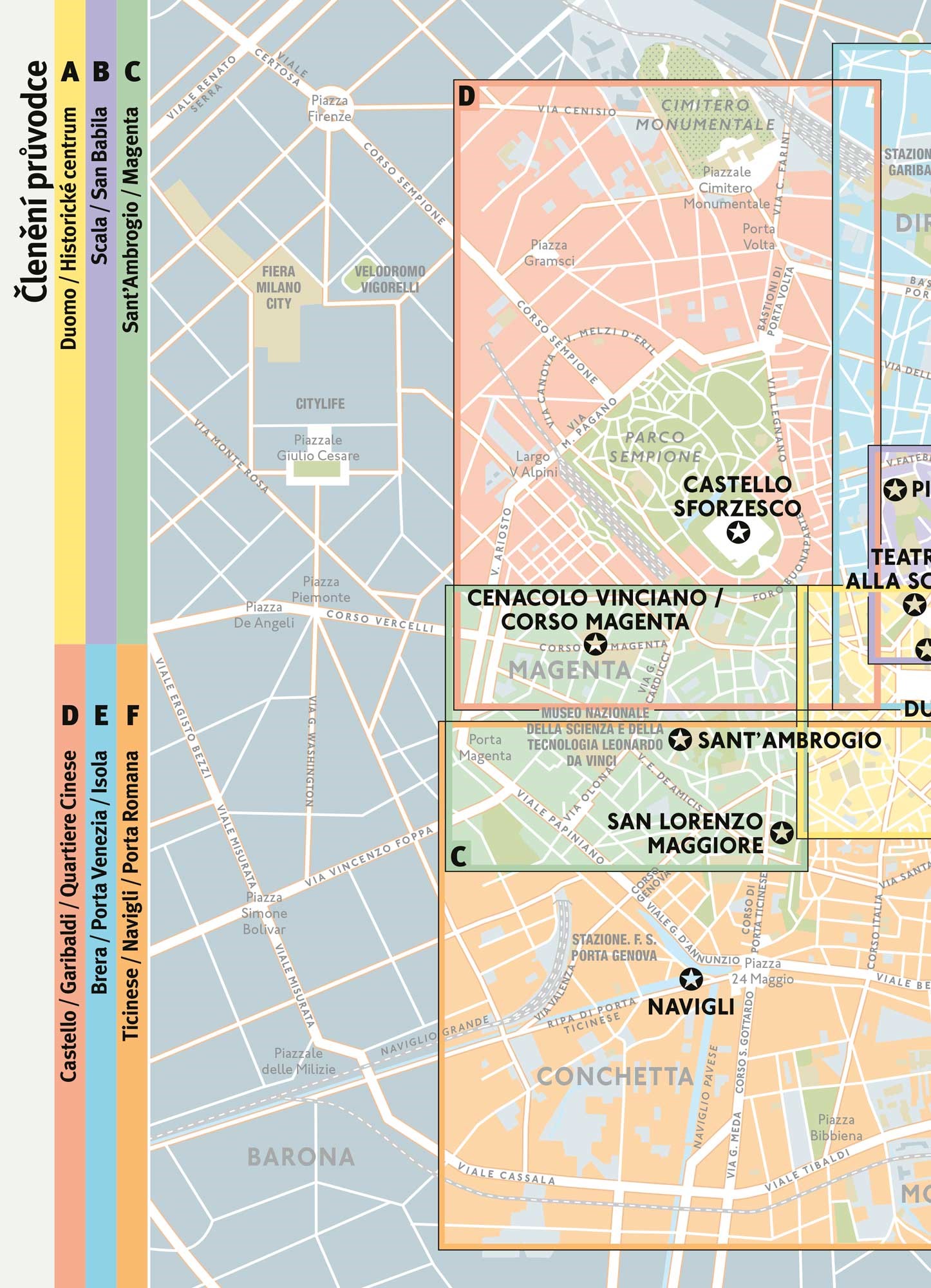 * Unikátní koncept: velká podrobná mapa, rozdělená na rozkládací mapky městských čtvrtí, v nichž vše snadno najdete