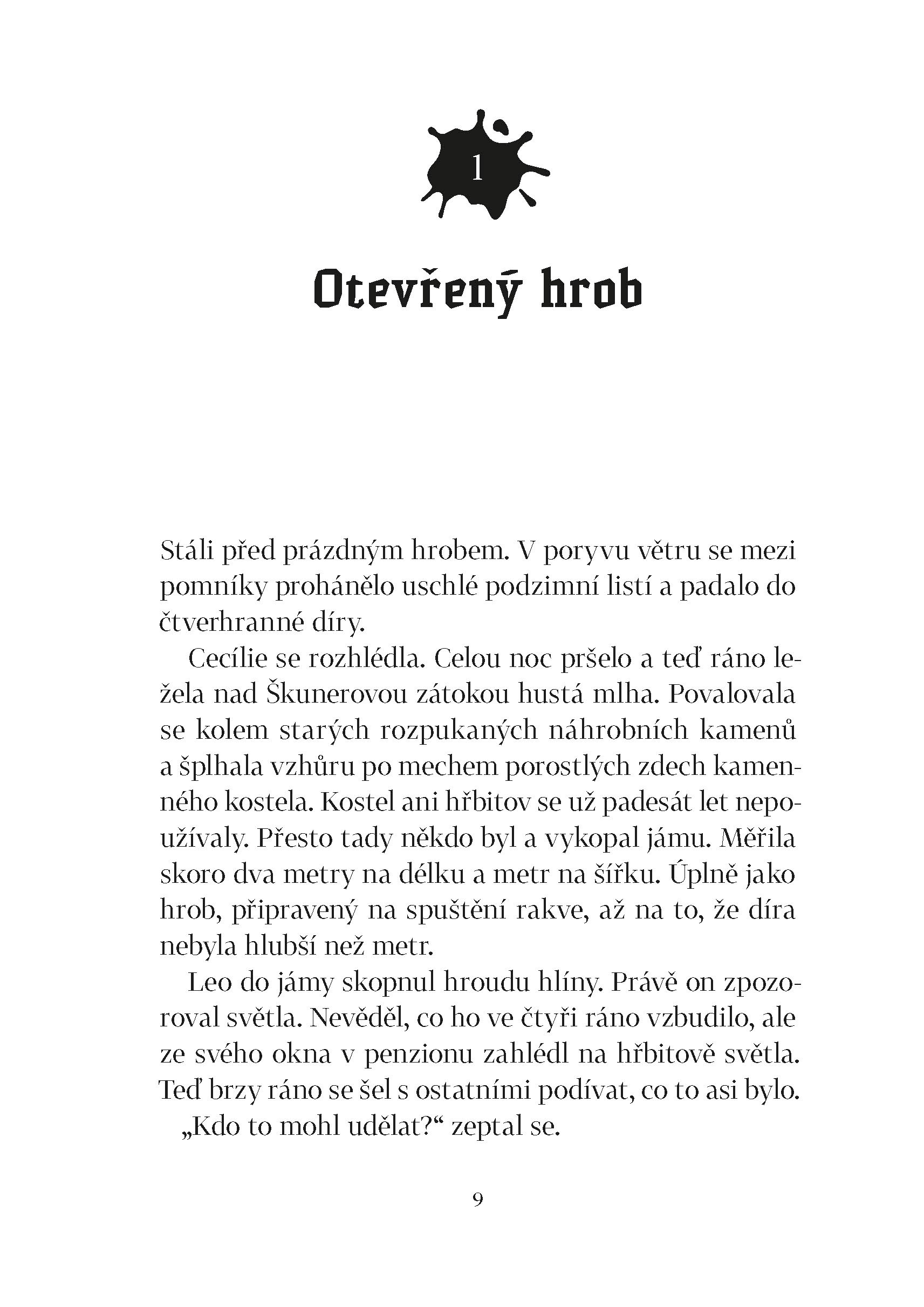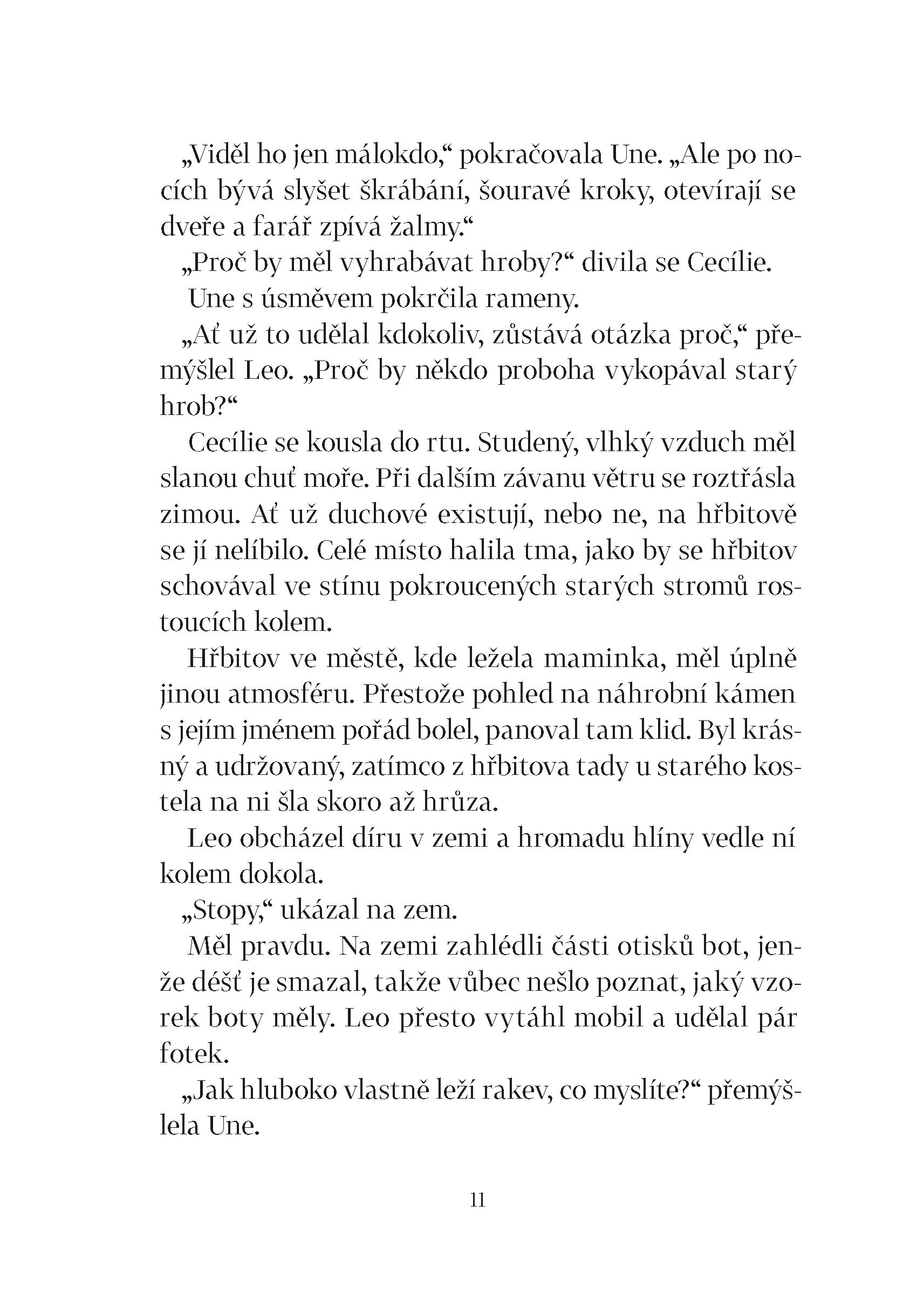 Škunerovou zátoku halí podzimní mlha. A v ní se dějí mrazivé věci. Na starém hřbitově, kde se už dávno nepohřbívá, zahlédne Leo v noci světla. Když se tam kamarádi zajdou podívat, zjistí, že někdo vykopává staré hroby, skoro jako by v nich něco hledal. Ale co? Na své cestě za rozluštěním záhady budou tentokrát Cecílie, Leo a Une muset často překonávat strach. Vždyť na hřbitově se prý zjevuje duch kněze, který před více než sto lety nepomohl posádce ztroskotané lodi. To však není jediný mrazivý příběh starého hřbitova a kostela. I varhaník popravený za války Němci po sobě zanechal tajemství. A možná i poklad. Ale zdá se, že Cecílie, Leo a Une nejsou na stopě ukrytému zlatu sami. Zároveň se kamarádi blíží i odhalení toho, kdo loni v létě zabil Cecíliinu maminku. Po objevení nahrávky z Ptáčníkovy kamery už totiž ani policie nevěří, že by šlo o nešťastnou náhodu...