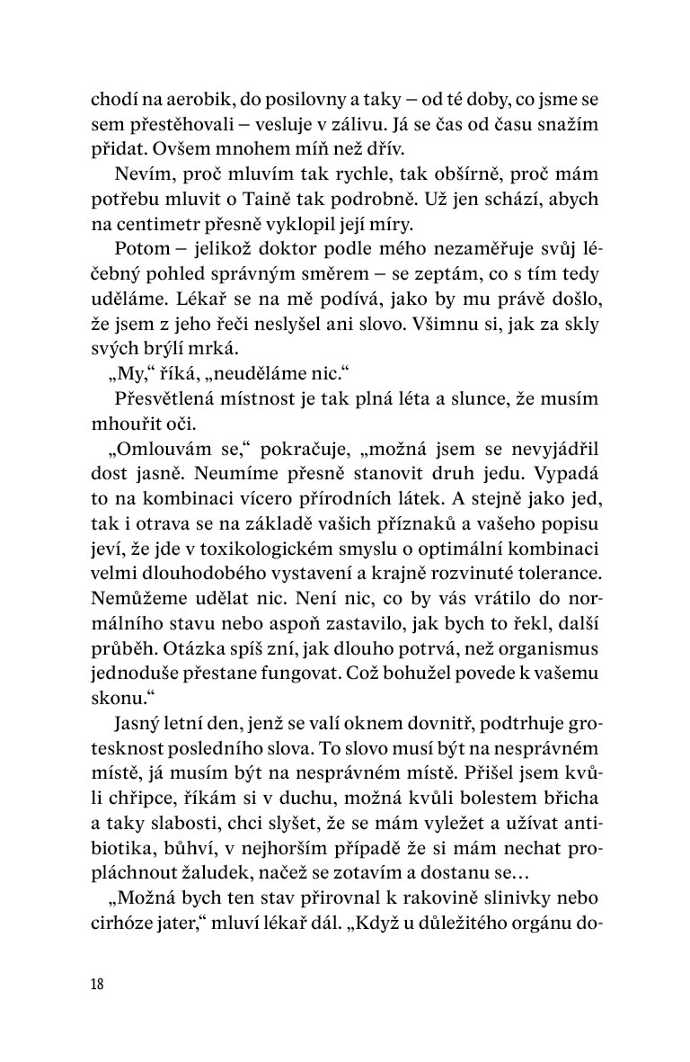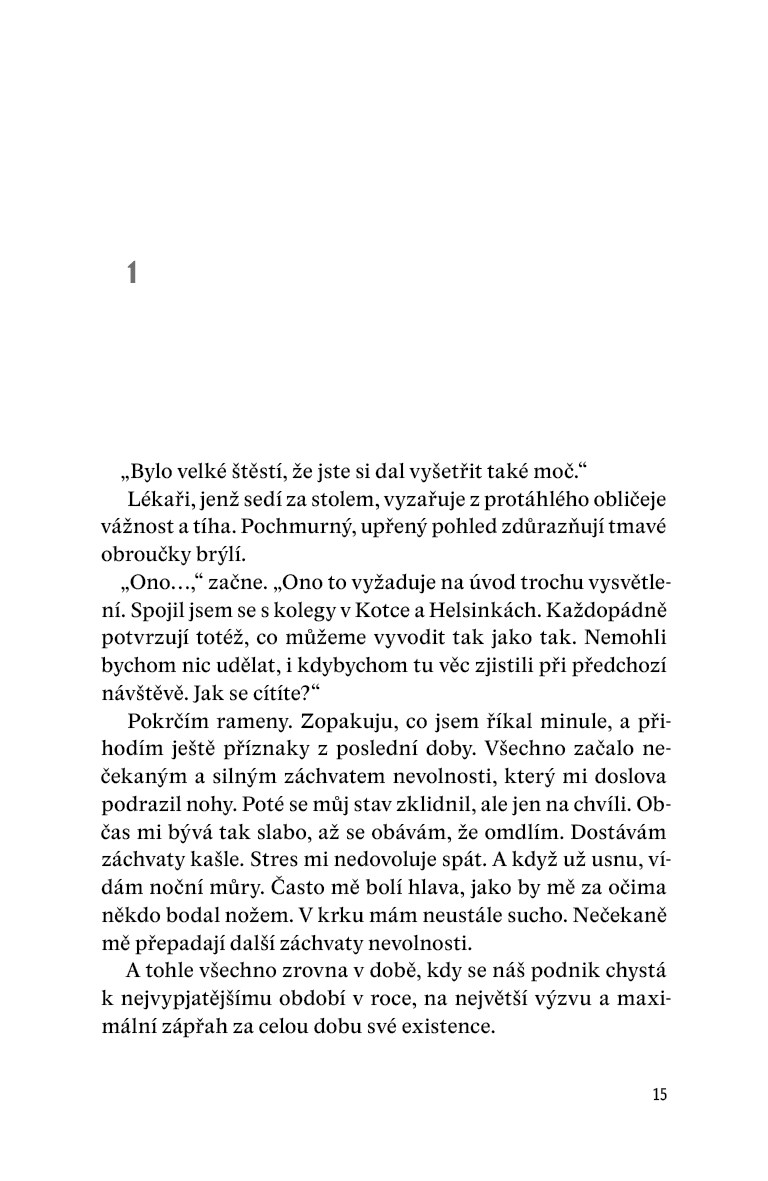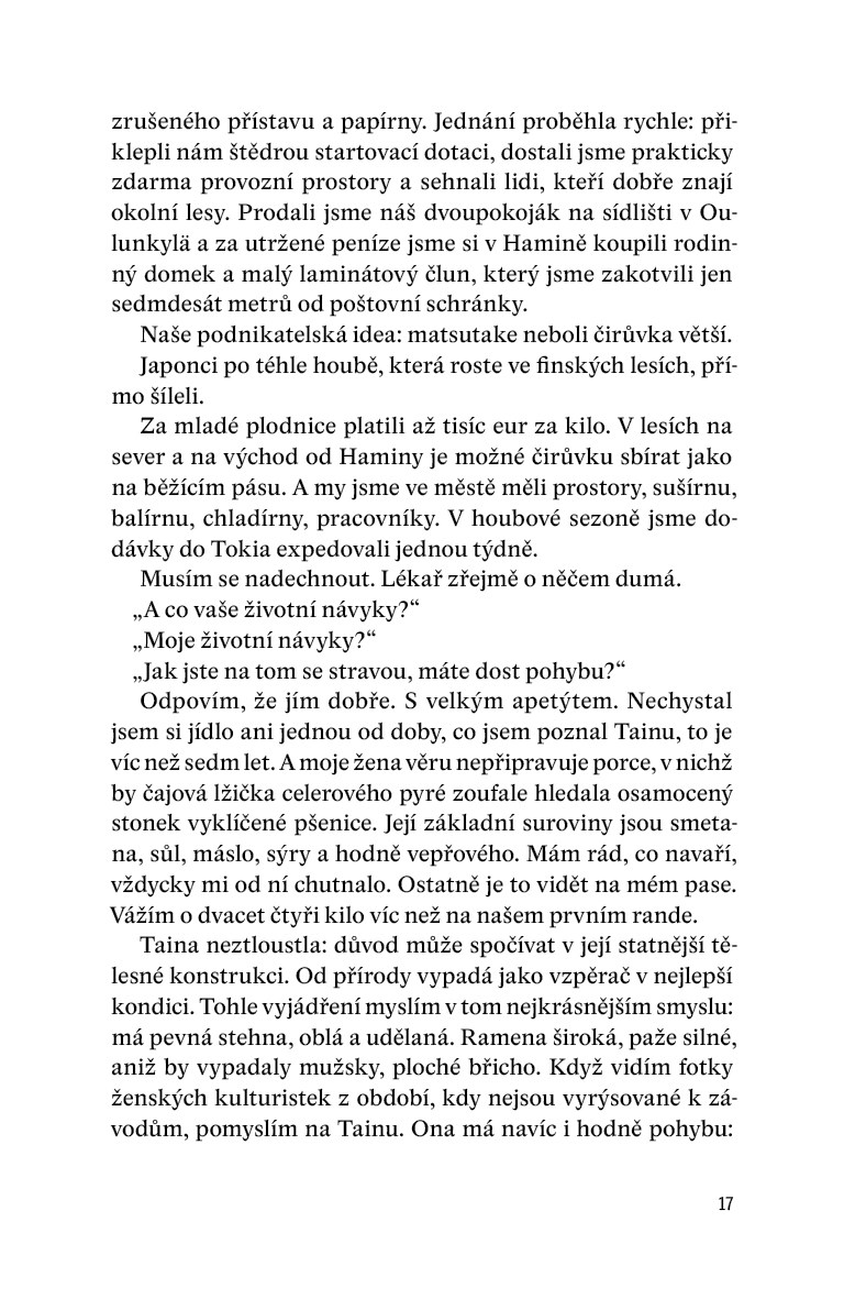 Jaakkovi je 37, když mu lékař oznámí, že nemá chřipku, ale umírá na otravu – a nemá už moc času. To člověku na dobré náladě nepřidá. A aby toho nebylo málo, když se z ordinace vrátí domů, přistihne svou ženu, jak si užívá s Petrim, mladým, přitažlivým zaměstnancem jejich společné firmy. Firmy, kterou začíná ohrožovat nebezpečná konkurence. Jaakko se rozhodne vypátrat toho, kdo mu usiluje o život. A taky chce, aby jeho firma prosperovala, až on tady nebude. Obchod s houbami matsutake, které se za vysoké ceny vyvážejí do Japonska, běží výtečně. A ve Finsku rostou ty nejkvalitnější. Ale zbraně nové konkurenční firmy mají skutečně tvrdý kalibr. Je to snad Jaakkova chyba, když začnou umírat její zaměstnanci? Ale copak má čas starat se o jiné lidi? Protože jedno je jasné: se smrtí za zády jde všechno rychleji a je potřeba užít si i využít každou minutu.