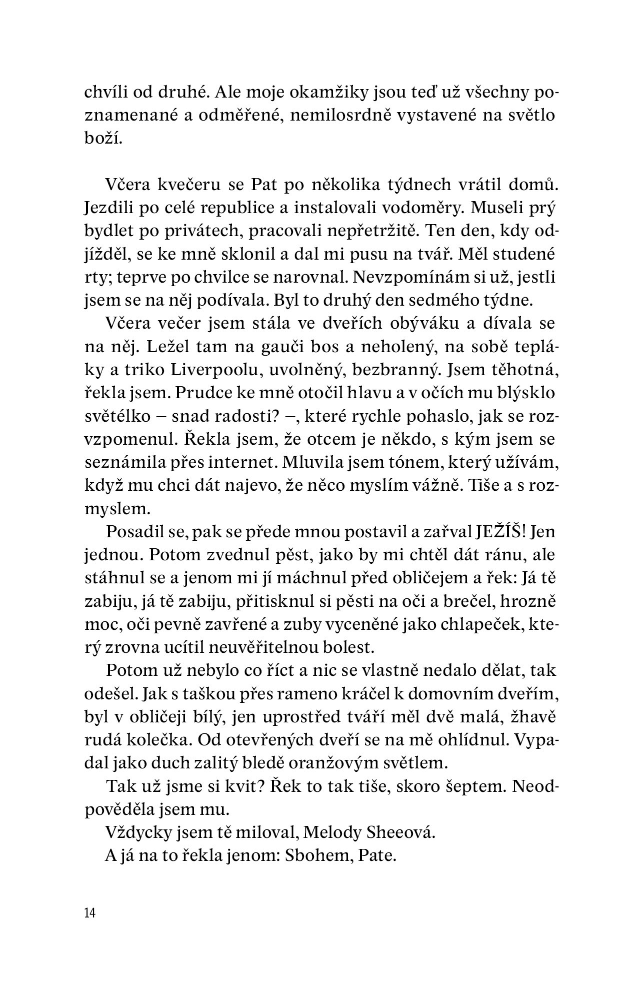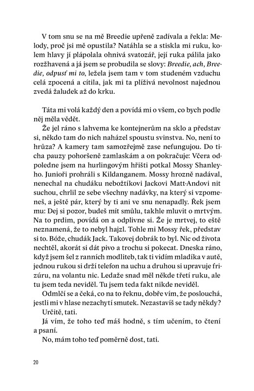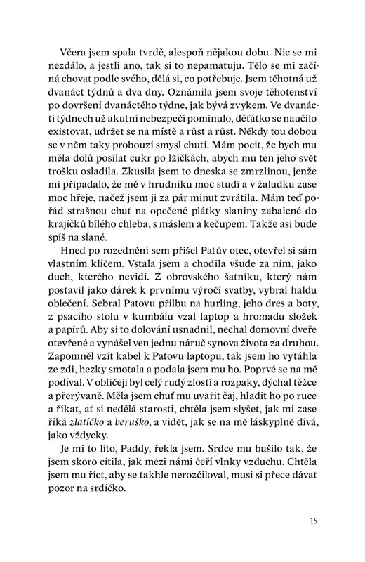 „Martin Toppy je syn slavného Kočovníka a otec mého nenarozeného dítěte. Je mu sedmnáct let, mně je třicet tři. Byla jsem jeho učitelka. Už dávno bych se zabila, kdybych k tomu měla odvahu.“ Těmito slovy začíná první deníkový záznam zoufalé Melody Sheeové, jejíž fascinující příběh sledujeme od dvanáctého týdne těhotenství až k jeho nevyhnutelnému závěru a následkům. Kniha nás vrací do známého prostředí Ryanových předchozích románů a setkáme se v ní tentokrát i s postavami irských kočovníků. Velká témata viny, pokání, oběti a vykoupení se rozvíjejí v každodenní, často humorné realitě malých lidských životů jako „antická tragédie na irském maloměstě“. Autorovo vypravěčské mistrovství dokáže čtenáře vtáhnout do příběhu, udržet v napětí, rozesmát i rozplakat.