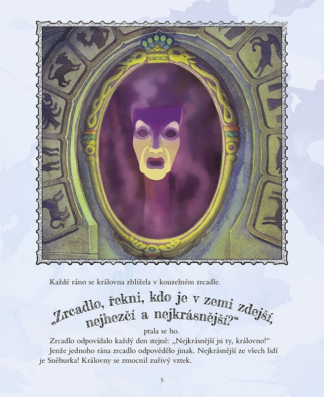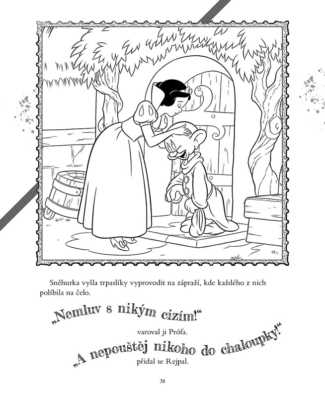Milá a laskavá Sněhurka dokázala okouzlit každého, s kým se setkala, kromě jediné osoby – své nevlastní matky, zlé královny. Když královně kouzelné zrcadlo vyjevilo, že nejkrásnější v zemi je právě Sněhurka, vyhnala nebohou dívku z domu. Sněhurka se v lese spřátelila se zvířátky a sedmi trpaslíky – Prófou, Kejchalem, Rejpalem, Štístkem, Stydlínem, Dřímalem a Šmudlou. Přečtěte si příběh o princezně, která má rty rudé jako krev, pleť bílou jako sníh a vlasy černé jako eben. Navíc vás čekají krásné obrázky, které si můžete sami vybarvit, a spousta veselých samolepek k doplnění příběhu.