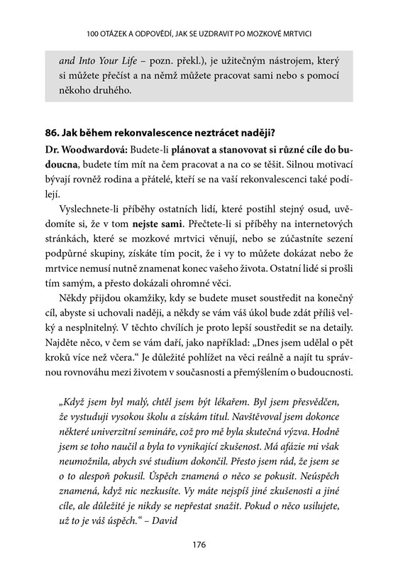 Pokud jste sáhli po této knize, s největší pravděpodobností jste vy nebo někdo, kdo je vám blízký, prodělali cévní mozkovou příhodu. Možná jste frustrovaní, zmatení a osamělí a nerozumíte všemu, co no vás chrlí lékaři, zdravotní sestry a všemožní odborníci. Autoři Mike a David vám nabízí podrobný návod, jak po této nové cestě, která se před vámi otevřela, postupovat. Kniha je plná rad, tipů, informací a zkušeností, o které se s autory podělili přední experti. Naleznete zde naději a dozvíte se, co všechno je možné. Příběh Davida ve vás probudí novou víru, když to budete nejvíce potřebovat.