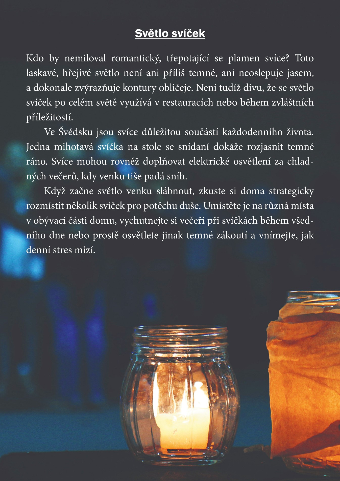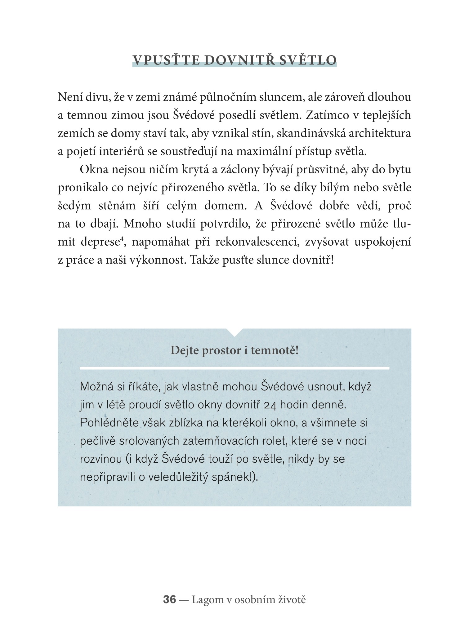 Slovo lagom znamená v preklade „tak akurát“ – podľa neho sa riadi všetko v živote Švédov, či už ide o výzdobu interiéru, času stráveného prácou alebo s rodinou, nákupy potravín a oblečenia, o delenie si povinností, lagom nájdete jednoducho v každučkej časti ich života.