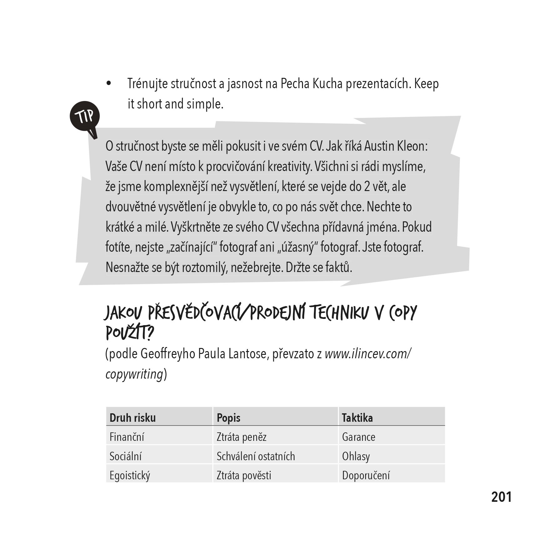 Udělejte v copywritingu další krok kupředu a vpusťte do něj pořádnou dávku inspirace. Díky 33 kapitolám nabitým tipy z autorčiny praxe i zkušenostmi světových osobností si uděláte z copywriterské rutiny kreativní dobrodružství. V 5 částech knihy se postupně naučíte přicházet s novými nápady, odhalíte motivace zákazníků, ujasníte si hlavní složky dobrého kousku copy a začnete vyprávět příběhy, které chytnou a nepustí. Každou inspiraci doplňují vysvětlující grafy, praktické pomůcky, cvičení pro rozpohybování mysli a také ilustrace talentovaného Ticha762.